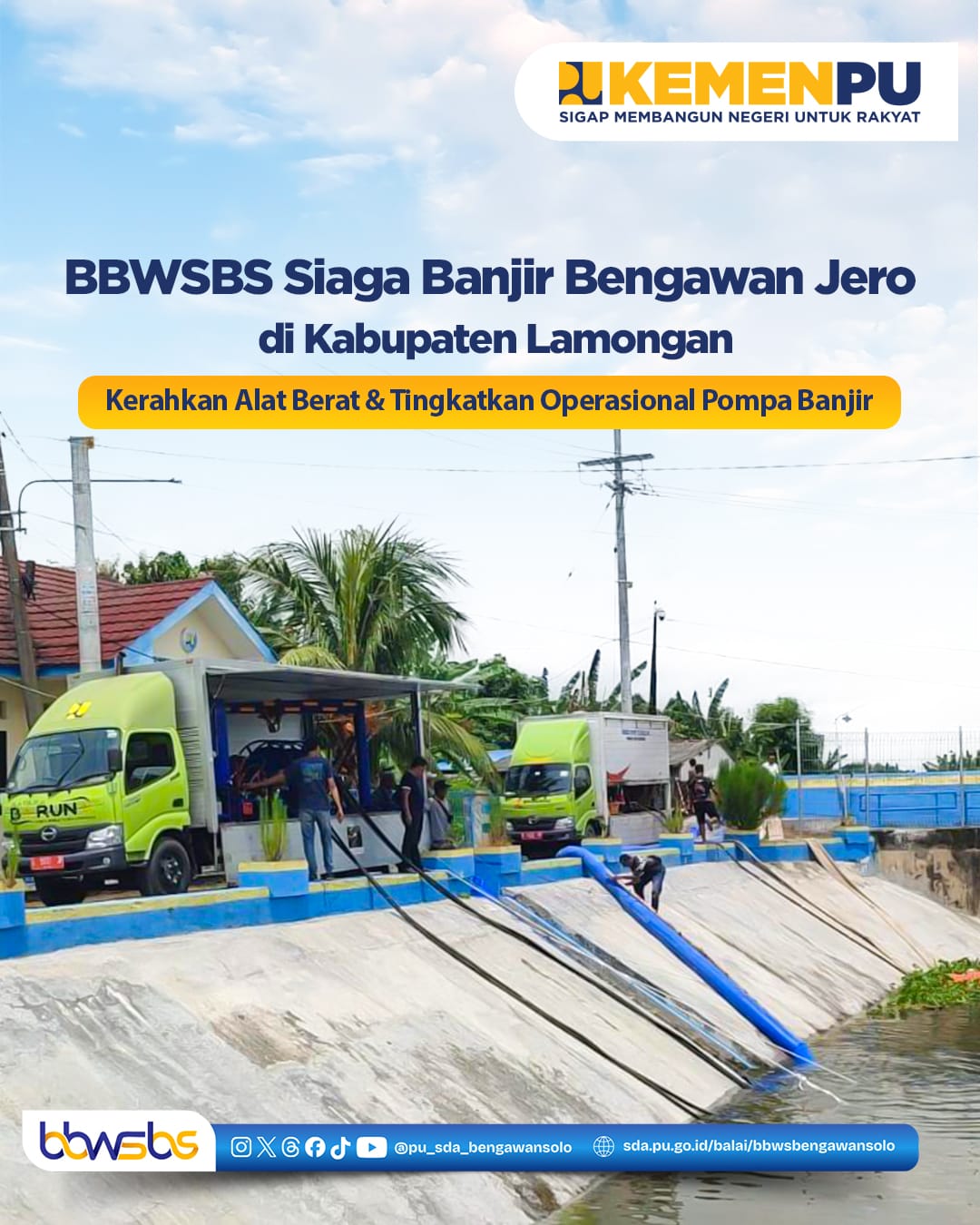 <div>BBWSBS telah melakukan upaya penanganan banjir yang merendam kawasan Bengawan Jero, Kabupaten Lamongan, Jawa Timur. Salah satu langkah yang dilakukan adalah meningkatkan operasional pompa banjir di Stasiun Pompa Banjir Kuro pada Jumat (23/1/2026).<br><br>Selain itu, BBWSBS juga menerjunkan sejumlah peralatan pendukung, yaitu 2 unit Trailer Pump, 2 unit Axial Pump, dan 1 unit Mobile Pump yang ditempatkan di hilir Sungai Blawi yaitu pada Pintu kuro yang terletak di Kelurahan Jatirenggo, Kecamatan Glagah, Kabupaten Lamongan.<br><br>Seluruh peralatan tersebut dioperasikan selama 12 jam untuk membantu mengurangi genangan air dan banjir di kawasan Bengawan Jero ketika Pintu Kuro tidak dapat dibuka dikarenakan tinggi muka air Sungai Blawi lebih rendah dari Sungai Bengawan solo.<br><br>Selain itu, BBWSBS juga melaksanakan pembersihan eceng gondok serta pengerukan sedimen di Sungai Blawi guna memperlancar pembuangan air dari Pintu Kuro.<br><br>BBWSBS berkomitmen untuk selalu siap dan siaga dalam menghadapi serta menangani bencana, khususnya banjir, demi melindungi masyarakat dan lingkungan sekitar.<br><strong><br></strong><br></div><div><strong>Operasional Pompa Banjir:<br></strong><br></div><div><strong>1. Trailer Pump: 01</strong><br> - Mulai Operasi: 07.00<br>- Selesai Operasi: 20.00<br>- Total Operasi: 12 Jam<br>- Debit Trailer Pump: 250 l/det<br> - Volume Trailer Pump: 10.800 m³<br><br><strong>2. Trailer Pump : 02</strong><br> - Mulai operasi : 07.00<br> - Selesai operasi : 20.00<br> - Total jam operasi : 12 jam<br> - Debit TP : 250 l/det<br> - Volume TP : 10.800 m³<br><br><strong>3. Axial Pump : 2 unit</strong><br>- Mulai operasi : 07.00<br>- Selesai operasi : 20.00<br>- Total jam operasi : 12 jam<br>- Debit Axial : 2000 l/det / unit <br>-Volume Axial : 172.800 m³<br><br><strong>4. Mobile Pump : 1 unit </strong><br>- Mulai operasi : 07.00<br>- Selesai operasi : 20.00<br>- Total jam operasi : 12 jam<br>- Debit Mobile Pump: 500 l/det<br>- Volume Mobile Pump: 21.600 m³ <br><br>*Catatan: Data laporan dapat berubah sewaktu-waktu sesuai dengan kondisi dan kebutuhan di lapangan<br><br></div><div><br></div>