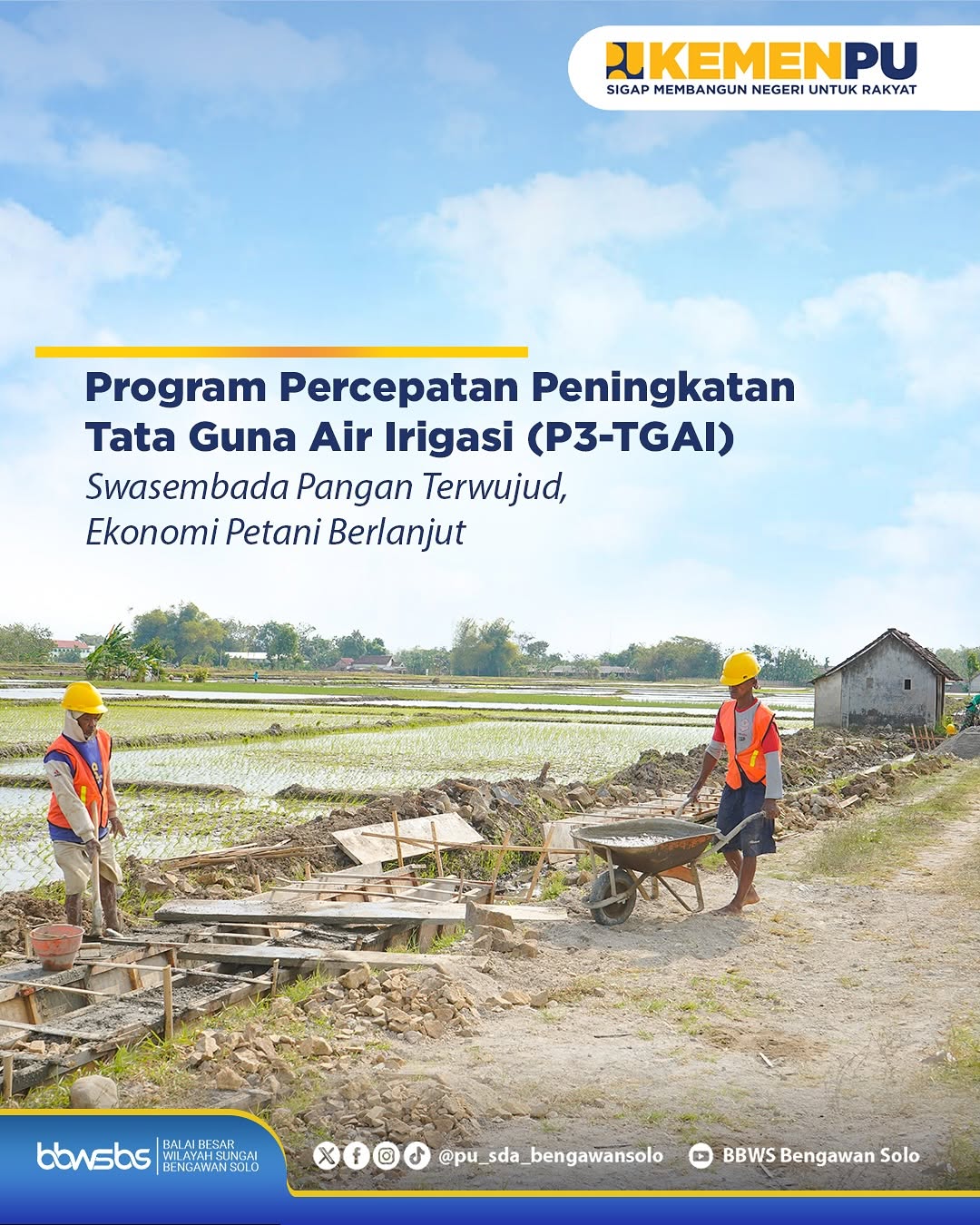 <div>Program Percepatan Peningkatan Tata Guna Air Irigasi (P3-TGAI) tidak hanya berfokus pada peningkatan saluran irigasi, tetapi juga mendorong pelaksanaan kegiatan pembangunan yang mengutamakan padat karya, dengan memaksimalkan tenaga lokal. Pendekatan ini diharapkan dapat membuka peluang kerja serta meningkatkan pendapatan masyarakat, khususnya di sektor pertanian.<br><br>Melalui pelaksanaan program tersebut, diharapkan:<br>✅ Pengelolaan jaringan irigasi berjalan lebih optimal.<br>✅ Hasil pertanian meningkat.<br>✅ Tercipta kontribusi nyata dalam menjaga ketahanan pangan nasional.<br><br></div>