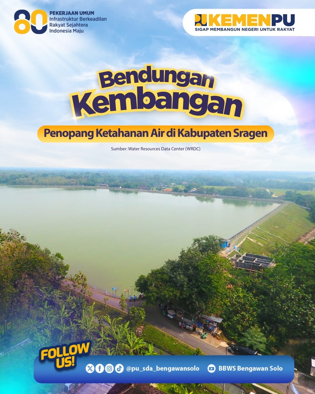 <div>#KoncoBengawan, yuk kenalan dengan Bendungan Kembangan<br> <br>Bendungan Kembangan merupakan tampungan air buatan yang berlokasi di Kecamatan Karangmalang, Kabupaten Sragen. Bendungan ini dibangun pada periode 1939–1940 dan menjadi salah satu infrastruktur sumber daya air yang memilik banyak manfaat bagi masyarakat.<br> <br>Bendungan Kembangan berperan penting dalam mendukung penyediaan air irigasi bagi lahan pertanian sekaligus membantu menjaga ketersediaan dan keberlanjutan sumber daya air di wilayah sekitarnya.<br> <br>Melalui pengelolaan dan pemeliharaan yang berkelanjutan, BBWSBS berkomitmen menjaga Bendungan Kembangan agar tetap berfungsi optimal, memberikan manfaat bagi masyarakat, serta mendukung ketahanan air di Wilayah Sungai Bengawan Solo.<br> </div><div><strong>Manfaat Bendungan</strong></div><div>Manfaat untuk irigasi seluas 386 Ha<br><br></div><div><strong>Data Teknis</strong></div><div>Tipe Bendungan : Urugan Tanah</div><div>Luas Genangan : 140,200 m²</div><div>Volume Total : 720,000 m³<br><br></div>