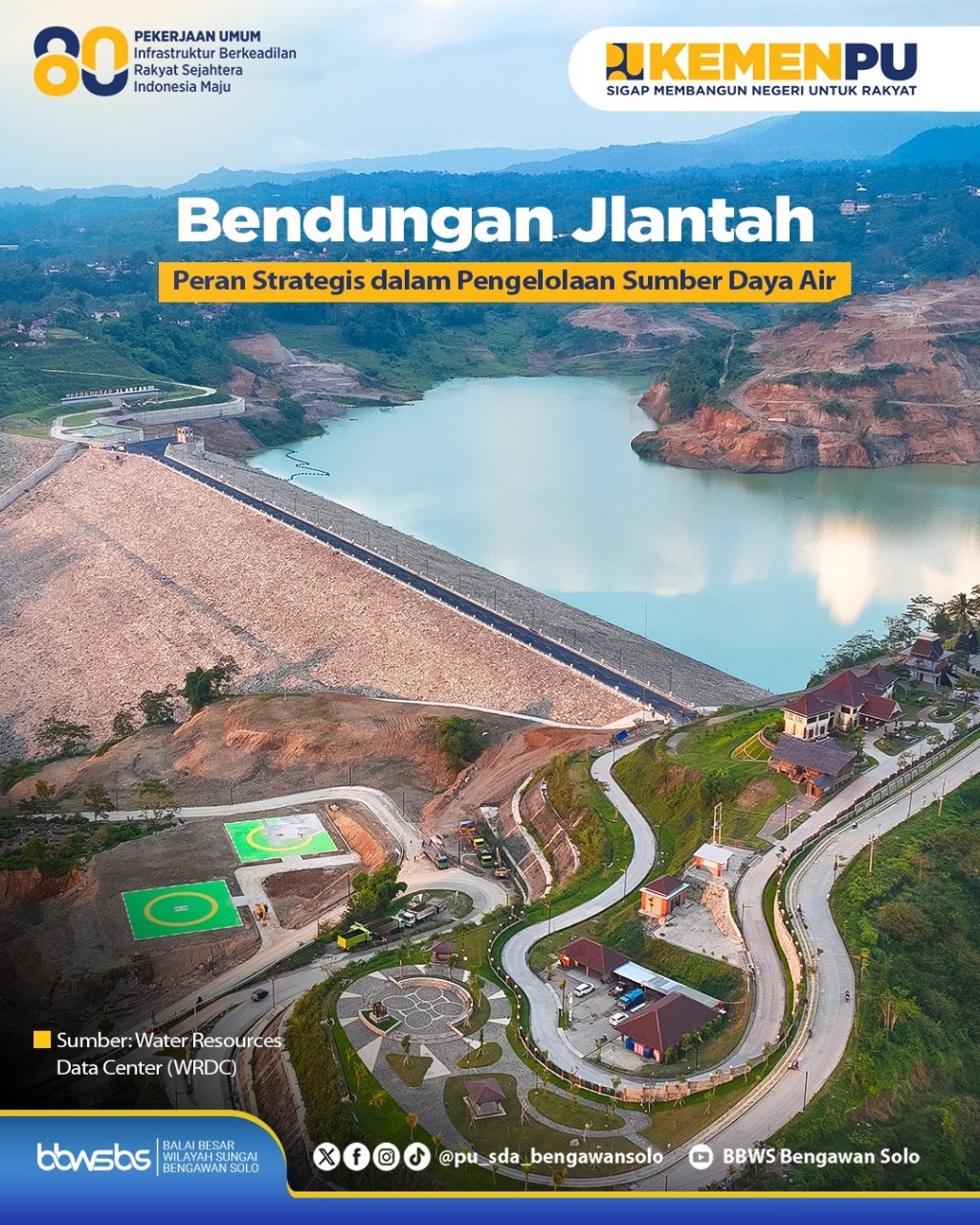 <div>Bendungan Jlantah merupakan salah satu infrastruktur sumber daya air yang berada di Kecamatan Jatiyoso, Kabupaten Karanganyar. Bendungan ini dibangun sebagai tampungan air buatan yang berfungsi menjaga ketersediaan air bagi masyarakat dan lingkungan sekitarnya.<br><br></div><div>Keberadaan bendungan ini memberikan manfaat penting, terutama untuk mendukung irigasi pertanian, penyediaan air baku, serta membantu mengurangi potensi banjir. Dengan pengelolaan yang baik, bendungan menjadi bagian dari upaya menjaga keseimbangan antara kebutuhan air dan kelestarian lingkungan.<br><br></div><div>Selain manfaatnya, Bendungan Jlantah juga memiliki peran strategis dalam konservasi sumber daya air. Tampungan air yang tersedia membantu menahan air saat musim hujan dan menyediakannya kembali saat musim kemarau.<br><br></div><div>BBWSBS terus berkomitmen mengelola dan memelihara Bendungan Jlantah agar dapat berfungsi optimal dan memberikan manfaat berkelanjutan bagi masyarakat serta mendukung ketahanan air di Wilayah Sungai Bengawan Solo.</div><div><br></div><div><strong>Manfaat Bendungan</strong></div><div>Irigasi 1,494 Ha</div><div>Penyediaan Air Baku 0.15 liter/detik</div><div>Reduksi Bajir 70.36 m³/detik<br><br></div><div><strong>Data Teknis</strong></div><div>Tipe Bendungan : Urugan Tanah</div><div>Luas Genangan : 535,000 m²</div><div>Volume Total : 11,960,000 m³<br><br></div><div> </div>