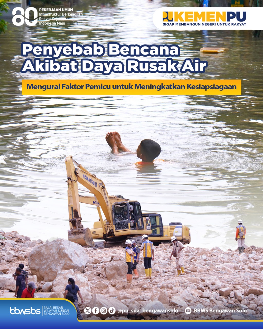 <div>Bencana akibat daya rusak air, seperti banjir, banjir bandang, erosi, sedimentasi, dan tanah ambles, merupakan ancaman yang dapat terjadi kapan saja. Risiko tersebut semakin nyata pada wilayah dengan dinamika sungai yang tinggi, seperti Sungai Bengawan Solo. Pemahaman terhadap karakteristik setiap jenis bencana menjadi langkah penting agar upaya mitigasi dapat dilakukan secara tepat dan responsif.<br><br>Banjir terjadi ketika debit air sungai melampaui kapasitas tampungnya. Pemicunya beragam, antara lain curah hujan tinggi, kondisi daerah aliran sungai, aliran permukaan, serta keberadaan sedimen dan sampah yang mengurangi kapasitas sungai. Sementara itu, erosi dan sedimentasi yang pada kondisi normal merupakan proses alami, dapat berkembang menjadi bencana sedimen massa apabila material dalam jumlah besar bergerak cepat, seperti pada aliran debris atau banjir lahar dingin.<br><br>Tanah ambles juga menjadi ancaman yang perlu diwaspadai. Fenomena ini terjadi akibat penurunan muka tanah yang dipicu oleh berkurangnya air tanah. Pada tanah berbutir lepas, penurunan dapat berlangsung relatif cepat sehingga berpotensi membahayakan permukiman dan infrastruktur di sekitarnya.<br><br>BBWS Bengawan Solo terus berkomitmen dalam pengelolaan sumber daya air secara terpadu melalui pemantauan kondisi sungai, pengurangan risiko bencana, serta peningkatan kesiapsiagaan masyarakat. Sinergi, kolaborasi, dan kewaspadaan bersama menjadi kunci untuk menjaga Wilayah Sungai Bengawan Solo tetap aman dan tangguh dalam menghadapi berbagai potensi bencana.</div>
