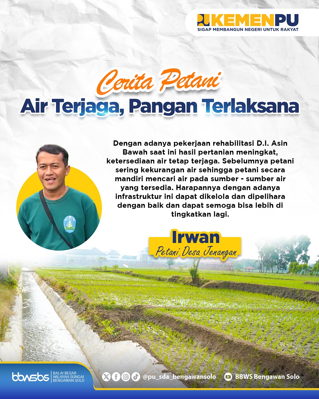 <div><a href="https://www.instagram.com/explore/tags/koncobengawan/">#KoncoBengawan</a>, air dari Telaga Ngebel menjadi sumber utama bagi sistem irigasi Daerah Irigasi (D.I.) Asin Bawah, yang mengalir melalui Sungai Asin dan ditampung oleh Bendung Bollu di bagian hulu serta Bendung Gombal di bagian hilir.<br><br>Tahun Anggaran 2025, dilakukan rehabilitasi D.I. Asin Bawah (Tahap II) di Kabupaten Ponorogo dan Madiun dengan panjang pekerjaan saluran primer dan sekunder 4,7 km dan luas manfaat mencapai 1.400 ha.<br><br>Melalui peningkatan infrastruktur irigasi ini, diharapkan distribusi air ke lahan pertanian menjadi lebih optimal, sehingga mendukung produktivitas pertanian masyarakat, sebagai bagian dari langkah nyata menuju ketahanan dan swasembada pangan nasional.</div>