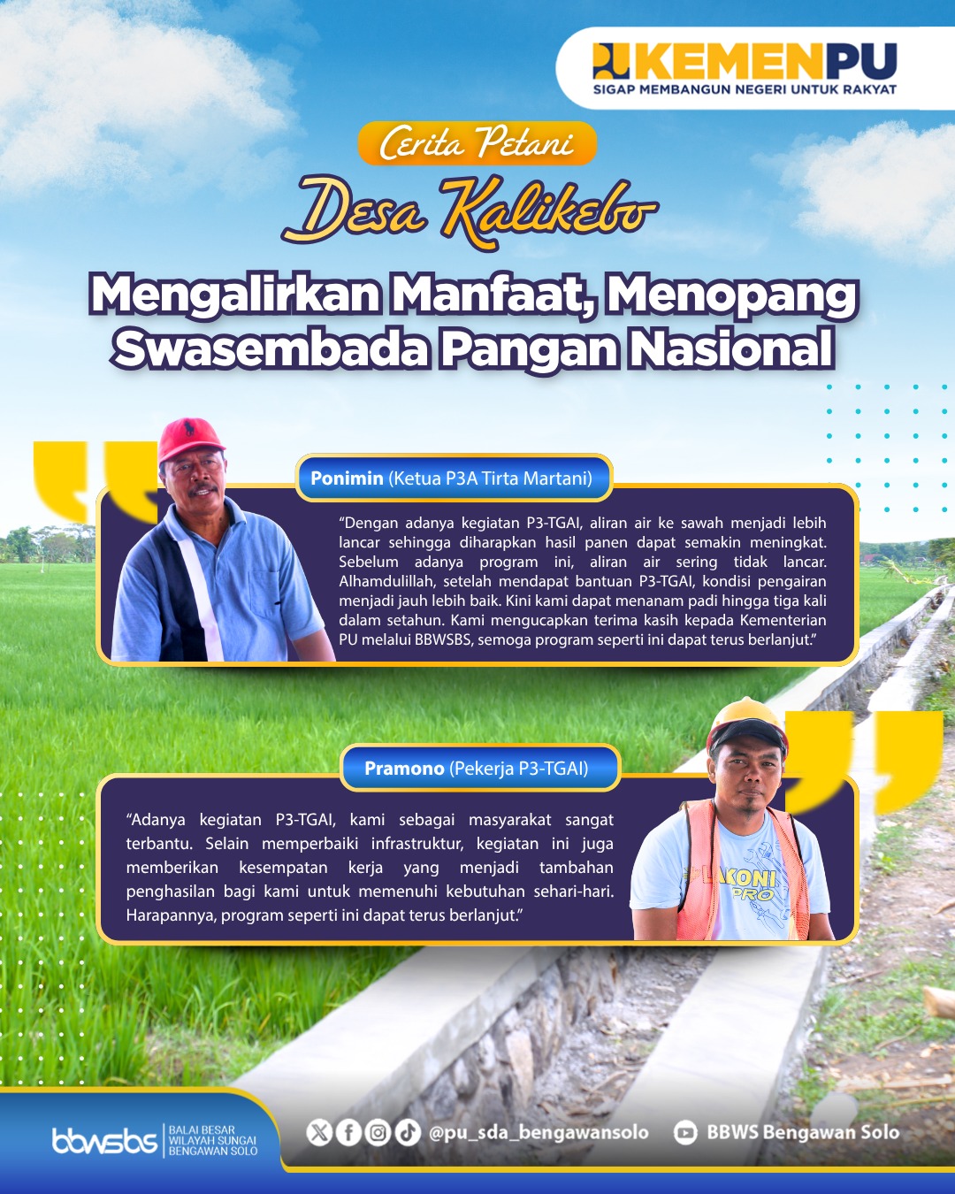 <div>Melalui program Percepatan Peningkatan Tata Guna Air Irigasi (P3-TGAI), BBWSBS berkomitmen mendukung peningkatan produktivitas pertanian melalui perbaikan jaringan irigasi di berbagai wilayah. Kegiatan ini tidak hanya memastikan kelancaran distribusi air ke lahan pertanian, tetapi juga berperan penting dalam meningkatkan hasil panen dan kesejahteraan petani.<br><br>Di Desa Kalikebo, Kecamatan Trucuk, Kabupaten Klaten, program P3-TGAI yang dilaksanakan oleh P3A Tirta Martani telah memberikan dampak nyata. BBWSBS bersama masyarakat terus berupaya menjaga ketersediaan air irigasi yang berkelanjutan. Upaya ini menjadi bagian penting dalam mewujudkan swasembada pangan nasional, demi terciptanya ketahanan pangan dan kesejahteraan bagi seluruh rakyat Indonesia.</div>