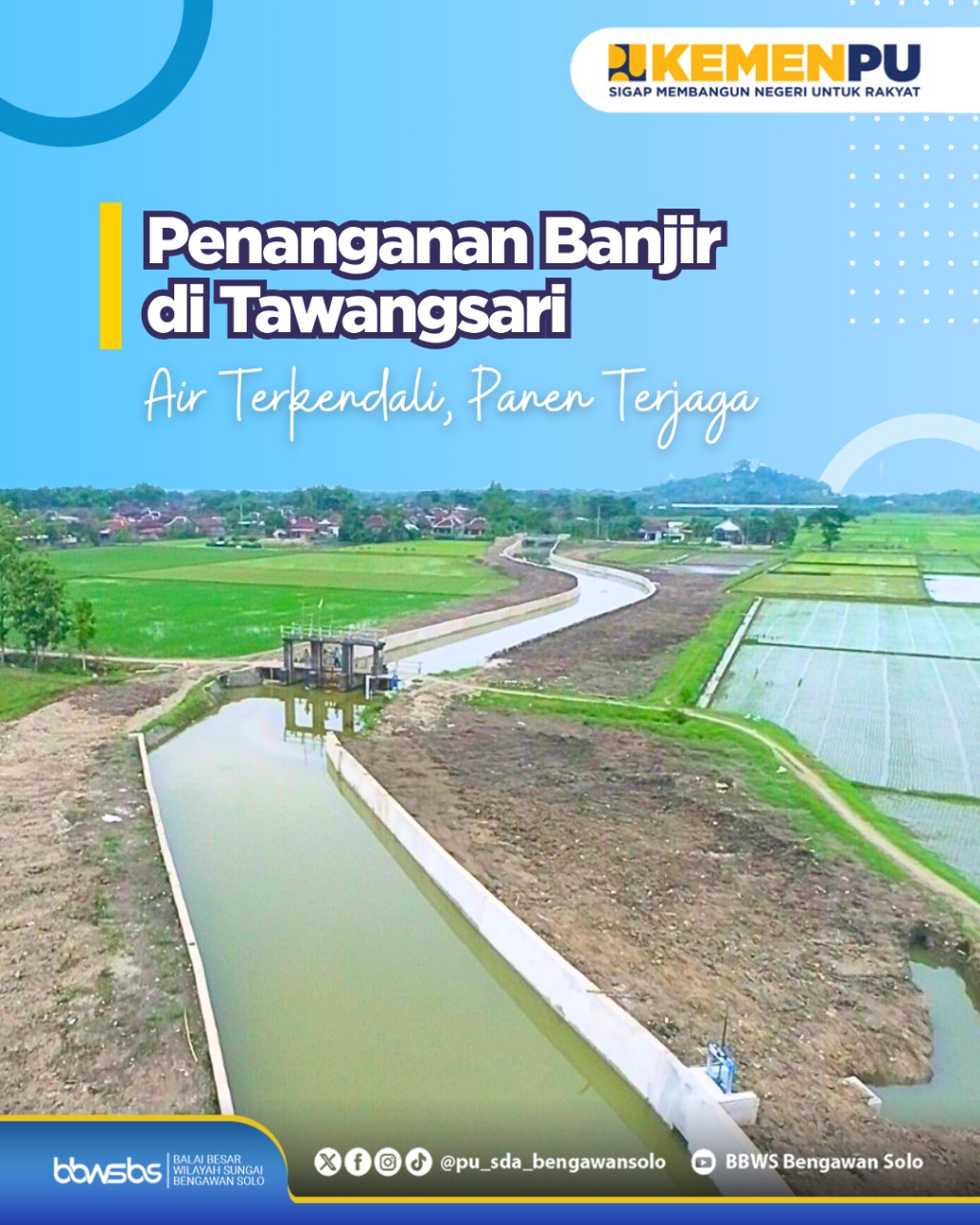 <div>Kawasan Tawangsari memiliki peran penting sebagai salah satu sentra pertanian dan permukiman di wilayah Sukoharjo. Namun, kondisi Sungai Kedung Jambal yang mengalami pendangkalan dan penyempitan selama ini membuat beberapa titik di Tawangsari rentan terdampak banjir, terutama saat musim hujan tiba.<br><br>Untuk mendukung ketahanan wilayah, dilakukan upaya penanganan banjir melalui normalisasi alur sungai, penguatan tebing, serta pembangunan fasilitas pengatur aliran air. Langkah ini bertujuan menjaga kelancaran aliran sungai, melindungi kawasan hunian, dan memastikan kebutuhan air bagi lahan pertanian tetap terpenuhi.<br><br>Kini manfaatnya mulai terlihat. Area yang sebelumnya rawan genangan menjadi lebih aman, aktivitas warga berjalan lebih nyaman, dan lahan pertanian dapat kembali produktif sepanjang musim. Penanganan ini menjadi wujud komitmen dalam meningkatkan kualitas lingkungan dan mendukung kesejahteraan masyarakat Tawangsari.</div>