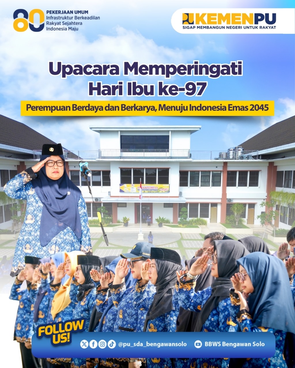 <div>BBWSBS memperingati Hari Ibu ke-97 Tahun 2025 yang diperingati setiap tanggal 22 Desember bersama Balai Teknik Sungai (BTS). Peringatan Hari Ibu tahun ini mengusung tema “Perempuan Berdaya dan Berkarya, Menuju Indonesia Emas 2045”.<br><br>Pada momen istimewa tersebut, upacara bendera dilaksanakan pada Senin (22/12/2025) di Kantor BBWSBS. Seluruh petugas upacara pada hari ini adalah perempuan sebagai wujud penghormatan atas peran, dedikasi, dan kontribusi perempuan dalam pengabdian kepada bangsa dan negara.<br><br>Melalui peringatan ini, BBWSBS dan BTS menegaskan komitmen untuk terus mendukung peran perempuan dalam pembangunan sumber daya air serta mendorong terciptanya lingkungan kerja yang inklusif, setara, dan berkeadilan.<br><br>Perempuan tidak hanya berperan sebagai pendukung, tetapi juga sebagai penggerak utama yang mampu berkontribusi nyata melalui kompetensi, profesionalisme, dan inovasi. Selamat Hari Ibu, terima kasih atas dedikasi, ketulusan, dan pengabdian yang terus menginspirasi. 🌸</div>