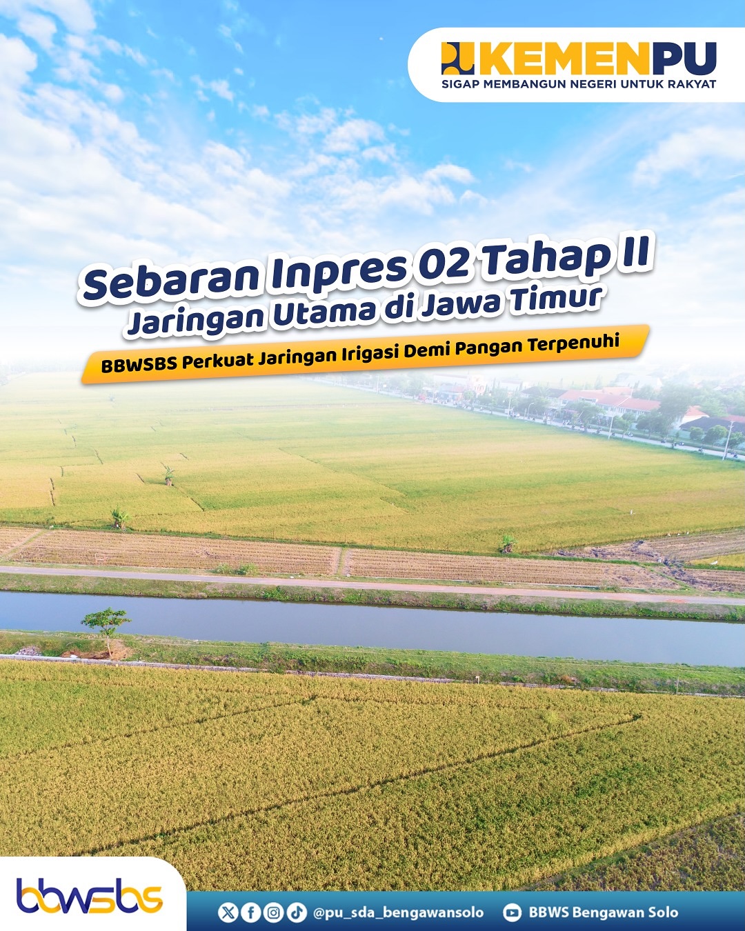 <div>Sebagai langkah nyata dalam mendukung terwujudnya swasembada pangan nasional, BBWSBS melaksanakan Rehabilitasi Jaringan Irigasi Daerah Irigasi (D.I.) Kewenangan Pemerintah Daerah di wilayah Jawa Timur. Upaya ini menjadi bagian penting dalam memastikan ketersediaan air irigasi yang andal bagi sektor pertanian.<br><br>Program rehabilitasi mencakup 49 Daerah Irigasi di 7 kabupaten, dengan total luas manfaat 5.625,44 hektare dan panjang pekerjaan saluran 49,94 kilometer.<br><br>Melalui rehabilitasi jaringan irigasi ini, BBWSBS terus berperan aktif dalam menjaga ketersediaan air bagi sektor pertanian, memperkuat fondasi ketahanan pangan, dan mendorong terwujudnya swasembada pangan yang berkelanjutan.<br><br></div>