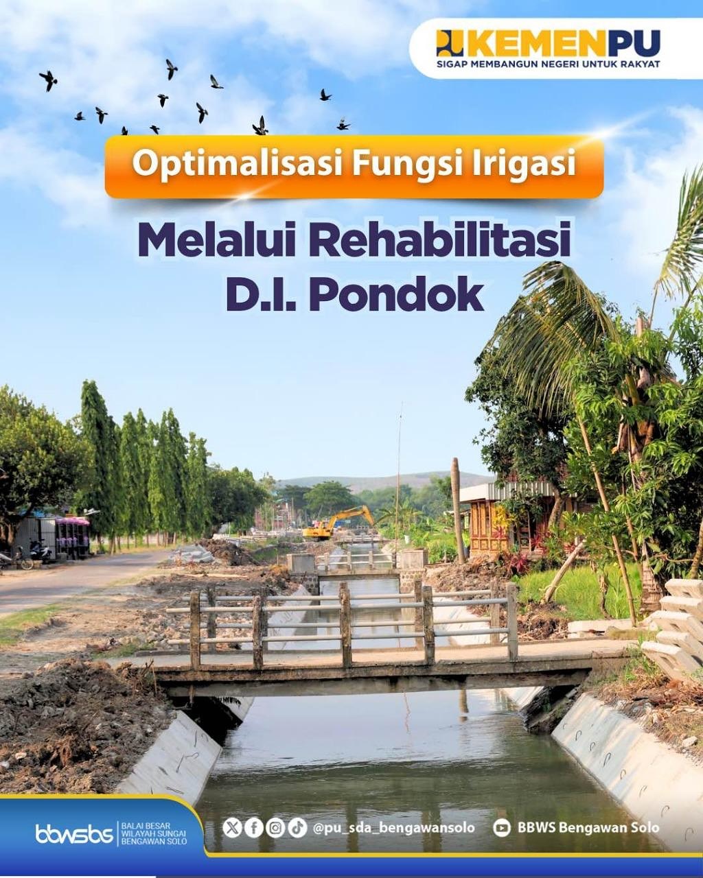 <div>Ketersediaan dan keterjaminan air irigasi menjadi faktor utama dalam mendukung keberhasilan sektor pertanian. Melalui kegiatan rehabilitasi jaringan irigasi Daerah Irigasi (D.I.) Pondok di Kabupaten Ngawi, Jawa Timur, BBWSBS berupaya meningkatkan kinerja dan efisiensi sistem irigasi secara optimal.<br><br>Kegiatan tersebut juga menjadi komitmen Kementerian Pekerjaan Umum melalui BBWSBS dalam memperkuat infrastruktur sumber daya air guna mendukung ketahanan dan swasembada pangan nasional. Irigasi yang terpelihara dengan baik akan memberikan dampak langsung terhadap peningkatan hasil pertanian serta kesejahteraan masyarakat di sekitar daerah irigasi.<br><br>Sebagai bagian dari pengawasan dan evaluasi lapangan, Kepala BBWSBS melakukan kunjungan kerja ke lokasi pekerjaan rehabilitasi jaringan irigasi D.I. Pondok pada Kamis (16/10/2025). Kunjungan tersebut mencakup peninjauan pada Saluran Sekunder Sambiroto Kanan dan Saluran Induk Sambiroto yang merupakan bagian dari lingkup pekerjaan rehabilitasi di wilayah tersebut</div>