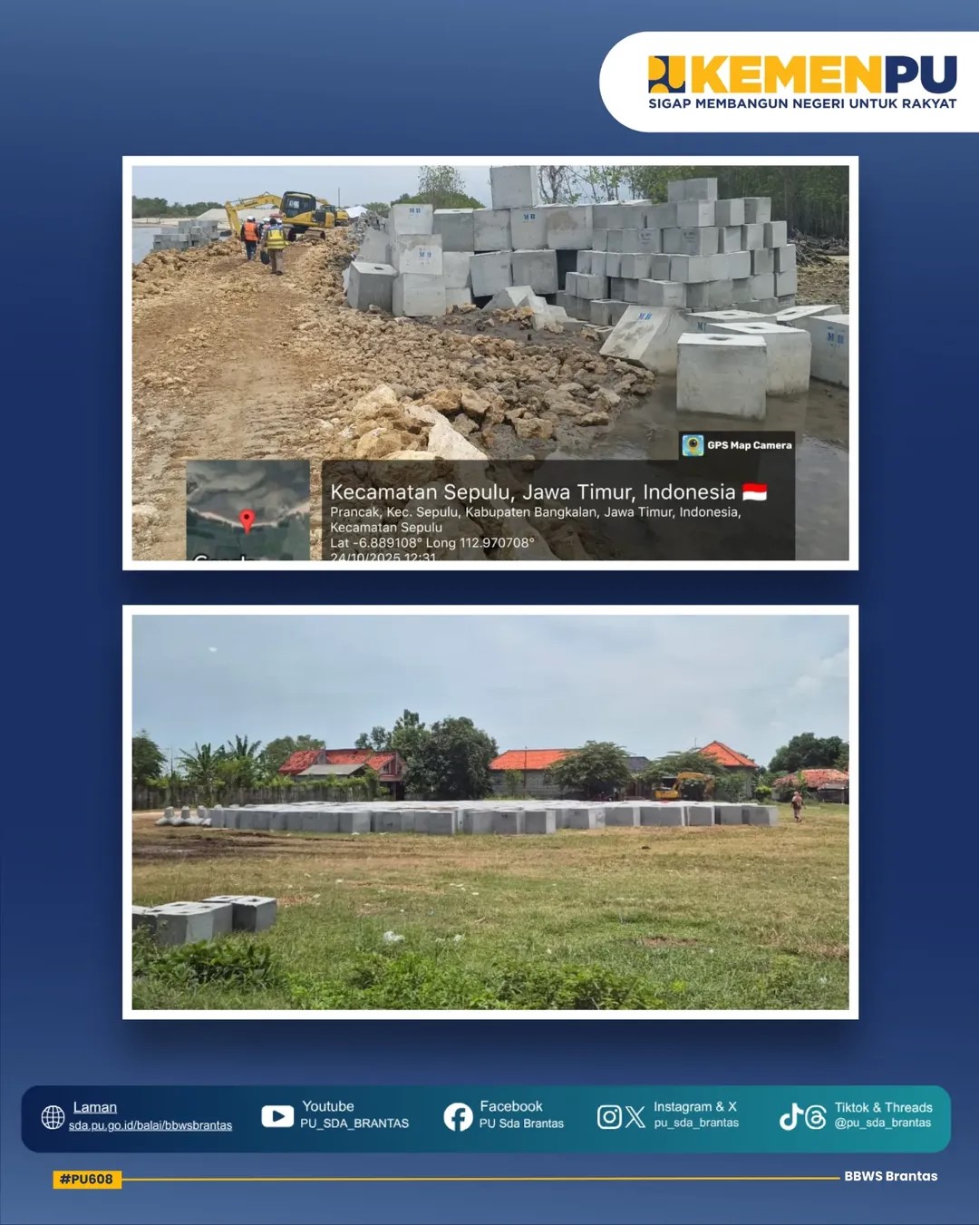24 Oktober 2025 – Bidang Pelaksanaan Jaringan Sumber Air (PJSA) bersama PPK Sungai dan Pantai II melaksanakan kegiatan monitoring dan evaluasi (monev) terhadap Proyek Pembangunan Pengaman Pantai di Pantai Sepulu, Desa Prancak, Kecamatan Sepulu, Kabupaten Bangkalan. Progres fisik pekerjaan saat ini telah mencapai 18,99%, dengan tantangan utama berupa keterbatasan waktu pelaksanaan akibat proses retender. Konstruksi pengaman pantai ini bertujuan untuk menahan laju abrasi, mempertahankan garis pantai, serta melindungi wilayah tambak masyarakat dari genangan air laut akibat pasang atau gelombang tinggi.