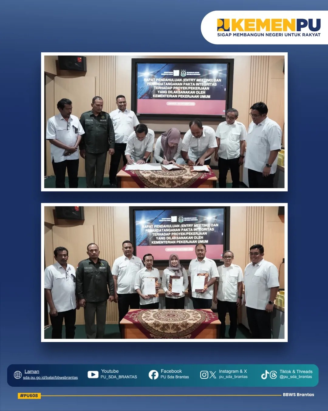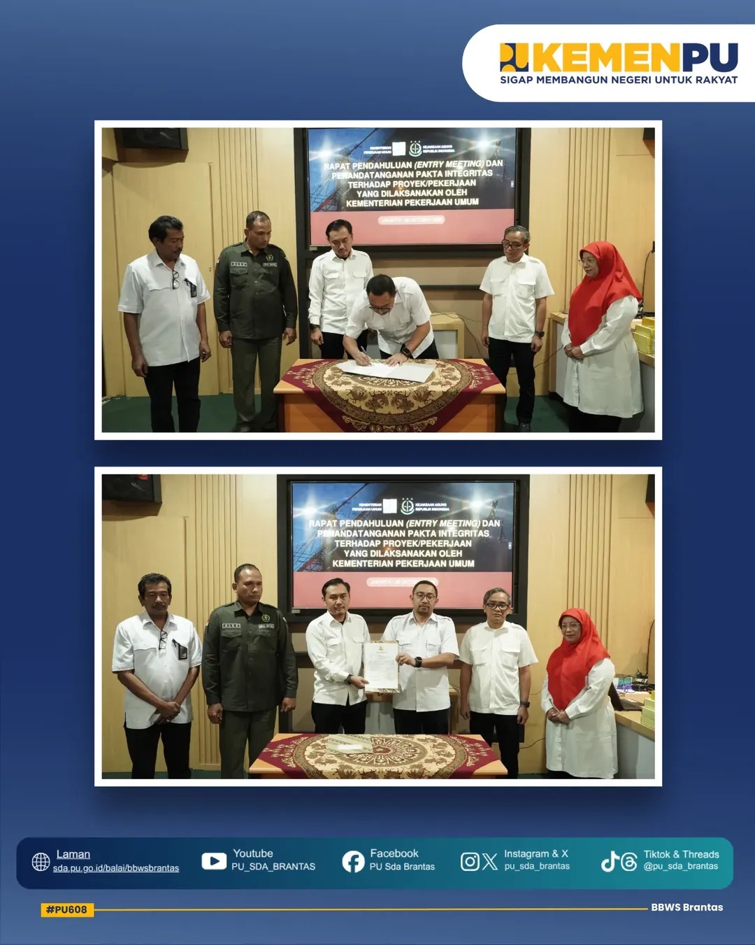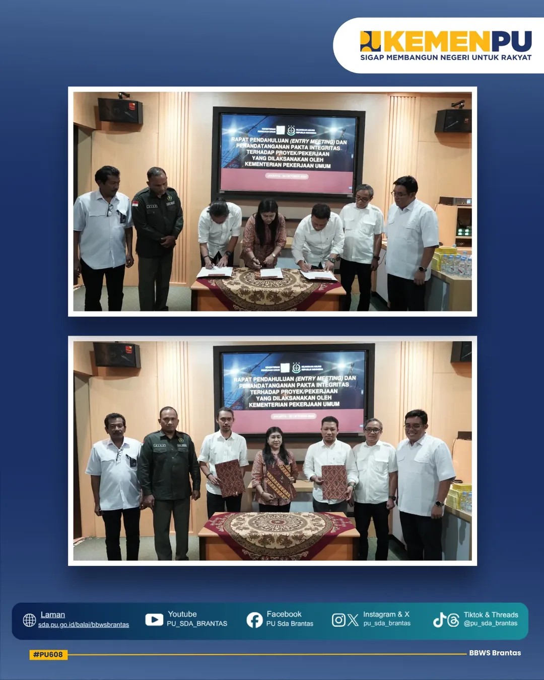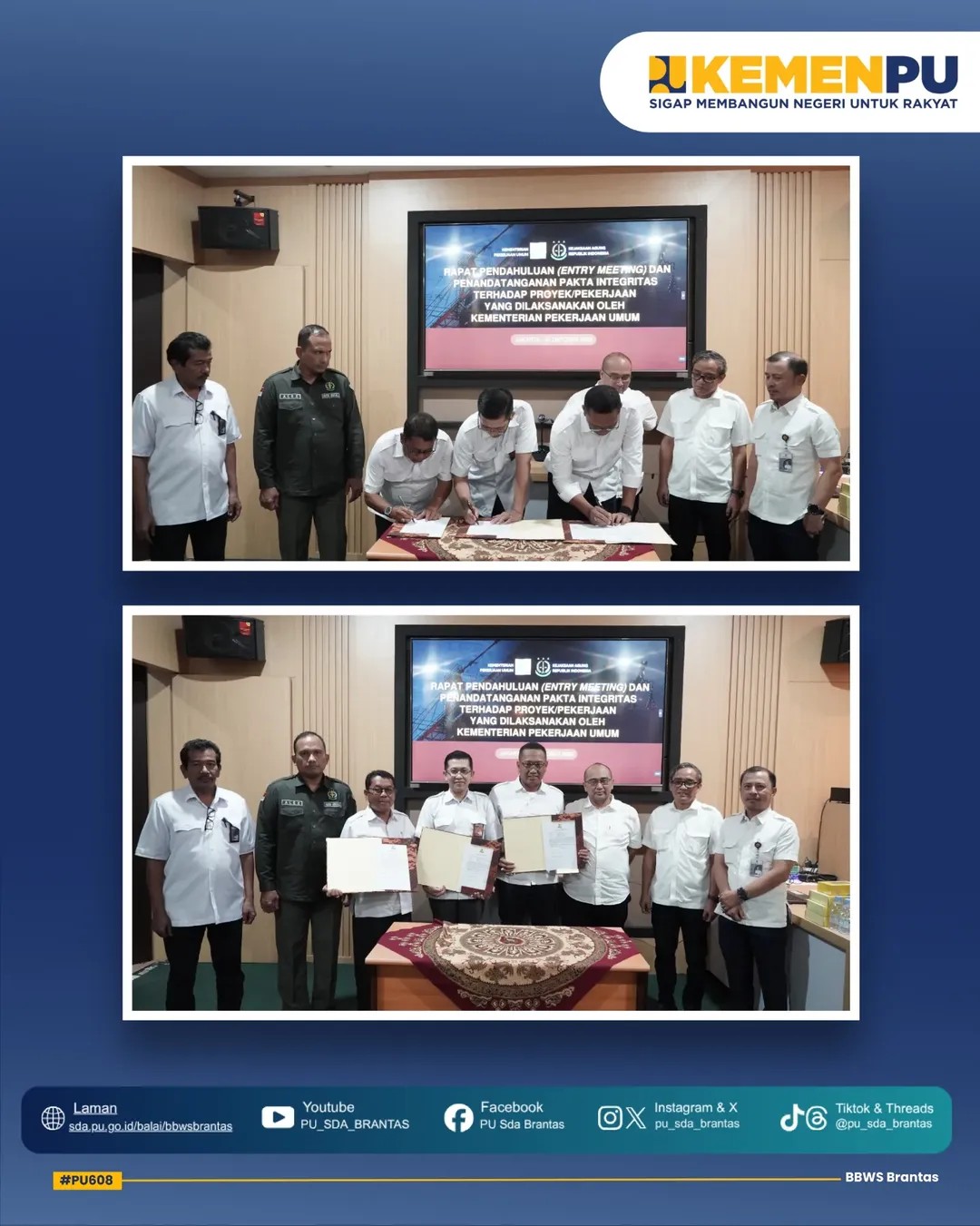 Acara diawali dengan penandatanganan Pakta Integritas oleh Penyedia Jasa bersama jajaran Pejabat Bidang, Satker, dan PPK di lingkungan BBWS Brantas yang disaksikan langsung oleh Kepala Balai BBWS Brantas, Bapak Muhammad Noor, bersama Perwakilan Kejaksaan Tinggi, Bapak Alexander.