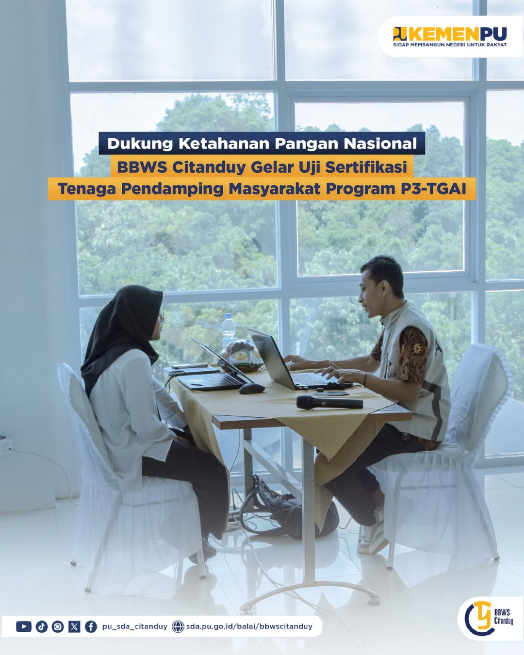 Hari ini, (15/10/2025), dilaksanakan Uji Sertifikasi Tenaga Pendamping Masyarakat pada kegiatan P3-TGAI Tahun Anggaran 2025, di Kantor Balai Besar Wilayah Sungai (BBWS) Citanduy. Melalui kegiatan ini, BBWS Citanduy dan Direktorat Jenderal Bina Konstruksi memastikan Tenaga Pendamping Masyarakat pada Kegiatan P3-TGAI memiliki keahlian dengan Jabatan Kerja Sertifikasi, yaitu Pengamat Irigasi, agar mampu bersaing di tingkat nasional maupun global.