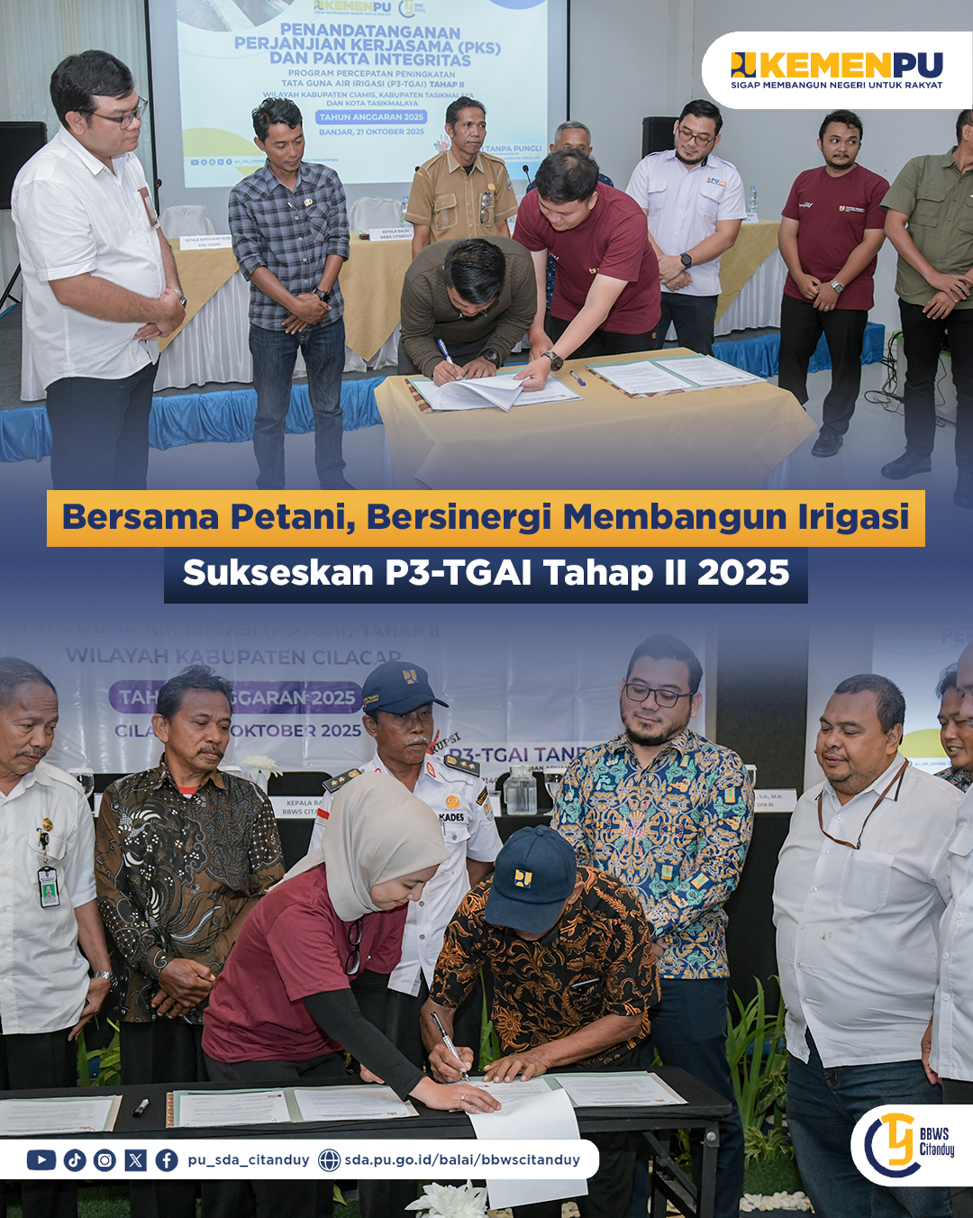 BBWS Citanduy melaksanakan kegiatan Penandatanganan Kerja Sama dan Pakta Integritas Program P3-TGAI Tahap II Tahun Anggaran 2025 pada Selasa-Rabu, (21–22/10/25). Langkah ini menjadi wujud komitmen bersama antara pemerintah dan masyarakat untuk mengelola sumber daya air secara partisipatif, transparan, dan berintegritas.