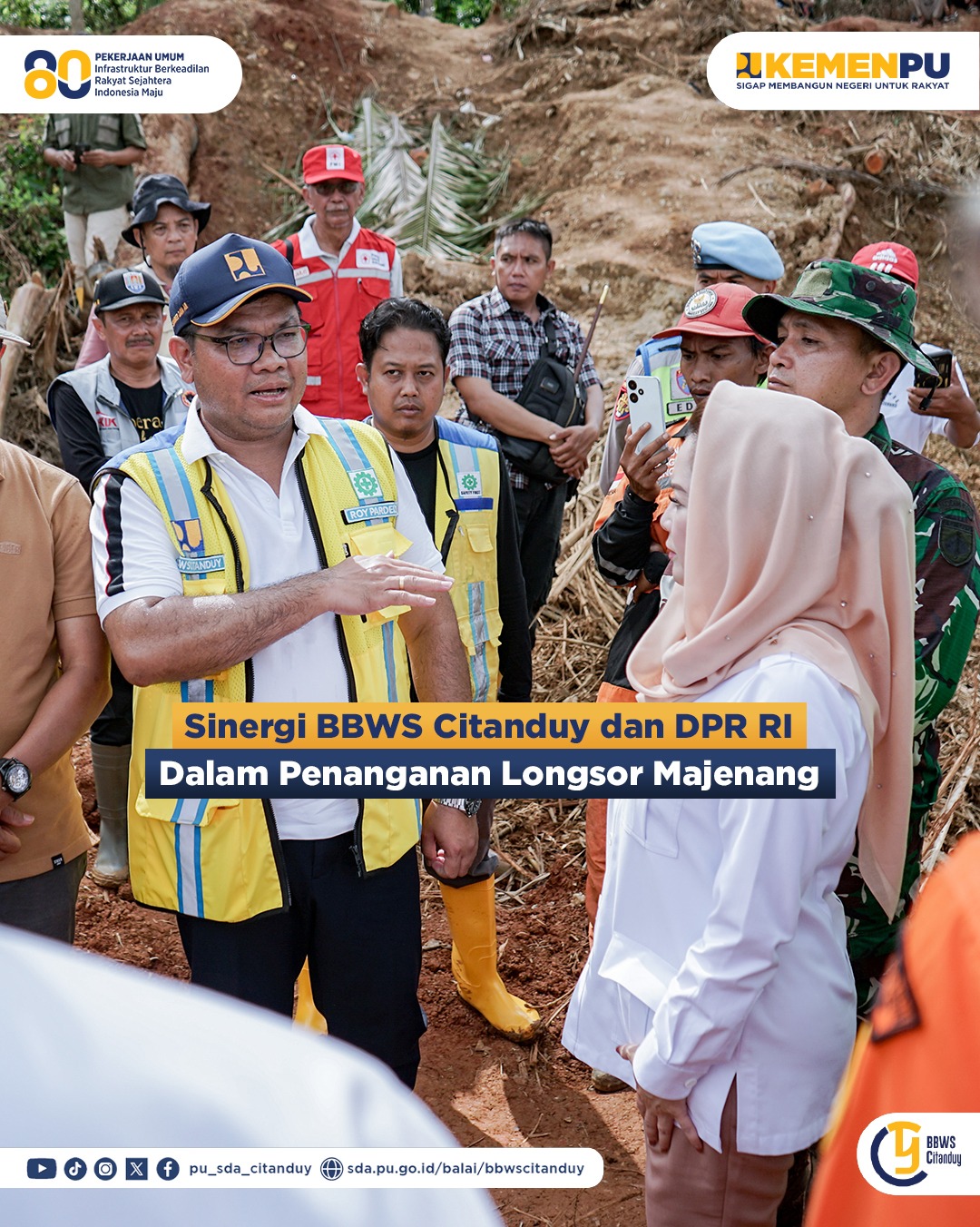 Sobat Citanduy, pada Sabtu (22/11/2025), Balai Besar Wilayah Sungai (BBWS) Citanduy turut mendampingi Anggota DPR RI, Novita Wijayanti, dalam kunjungan penanganan bencana alam longsor di Desa Cibeunying, Kecamatan Majenang, Kabupaten Cilacap.