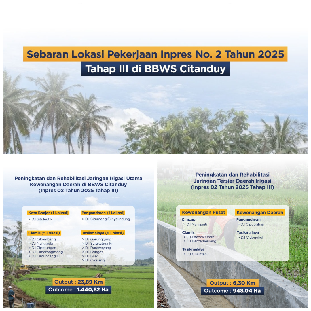Sobat Citanduy.. Tahukah kamu?Pekerjaan Inpres 02 Tahun 2025 Tahap III di BBWS Citanduy tersebar di sejumlah lokasi dengan fokus peningkatan prasarana sumber daya air.Yuk, kenali titik-titiknya!#SigapMembangunNegeri#MengelolaAirUntukNegeri#IrigasiUntukSwasembadaPangan#SetahunBerdampak@bakom.ri