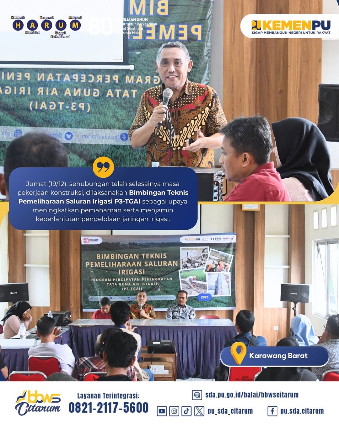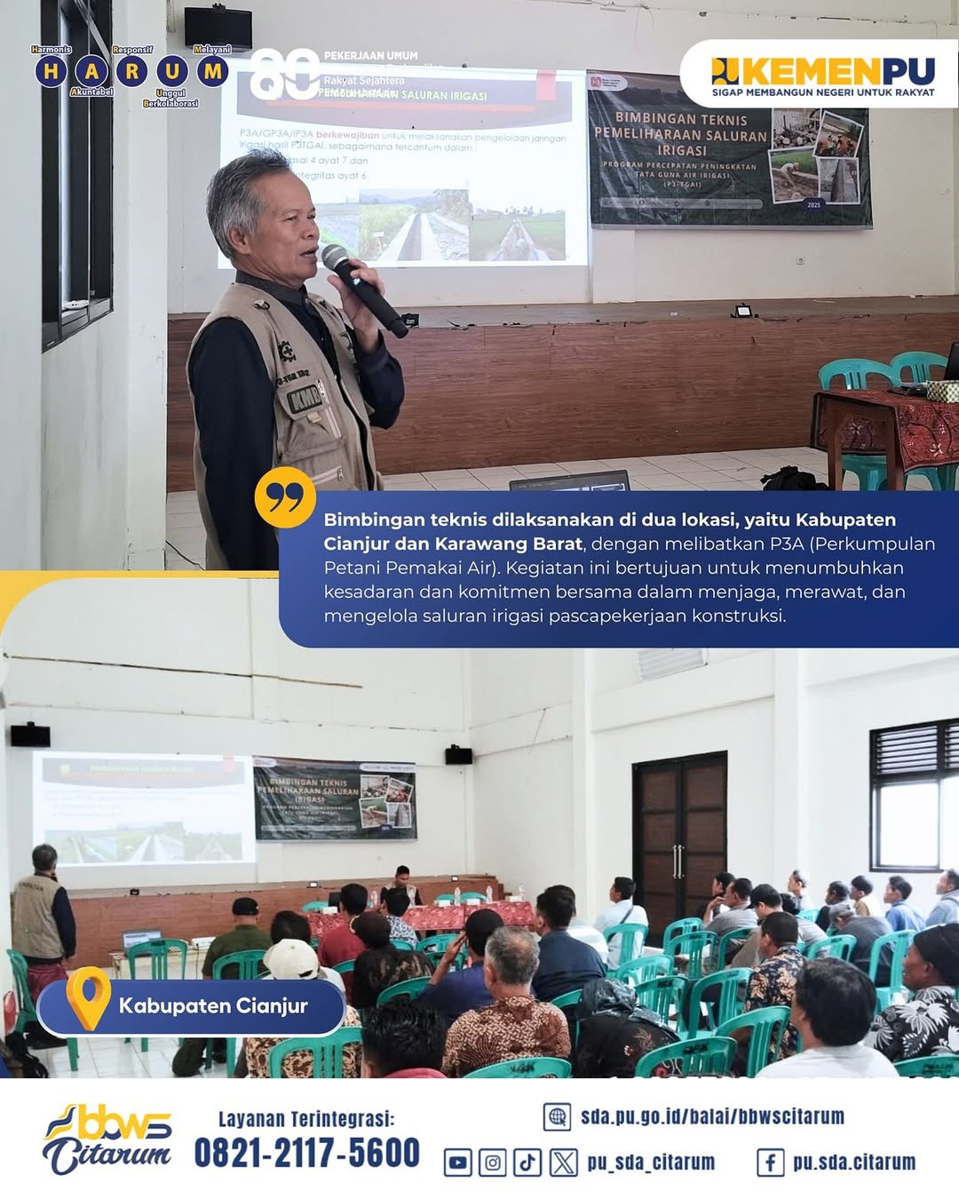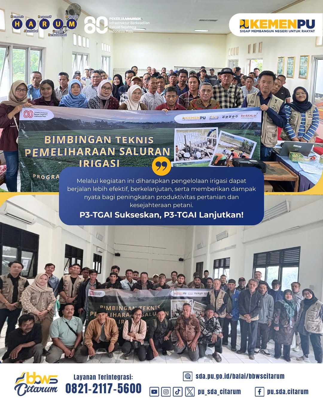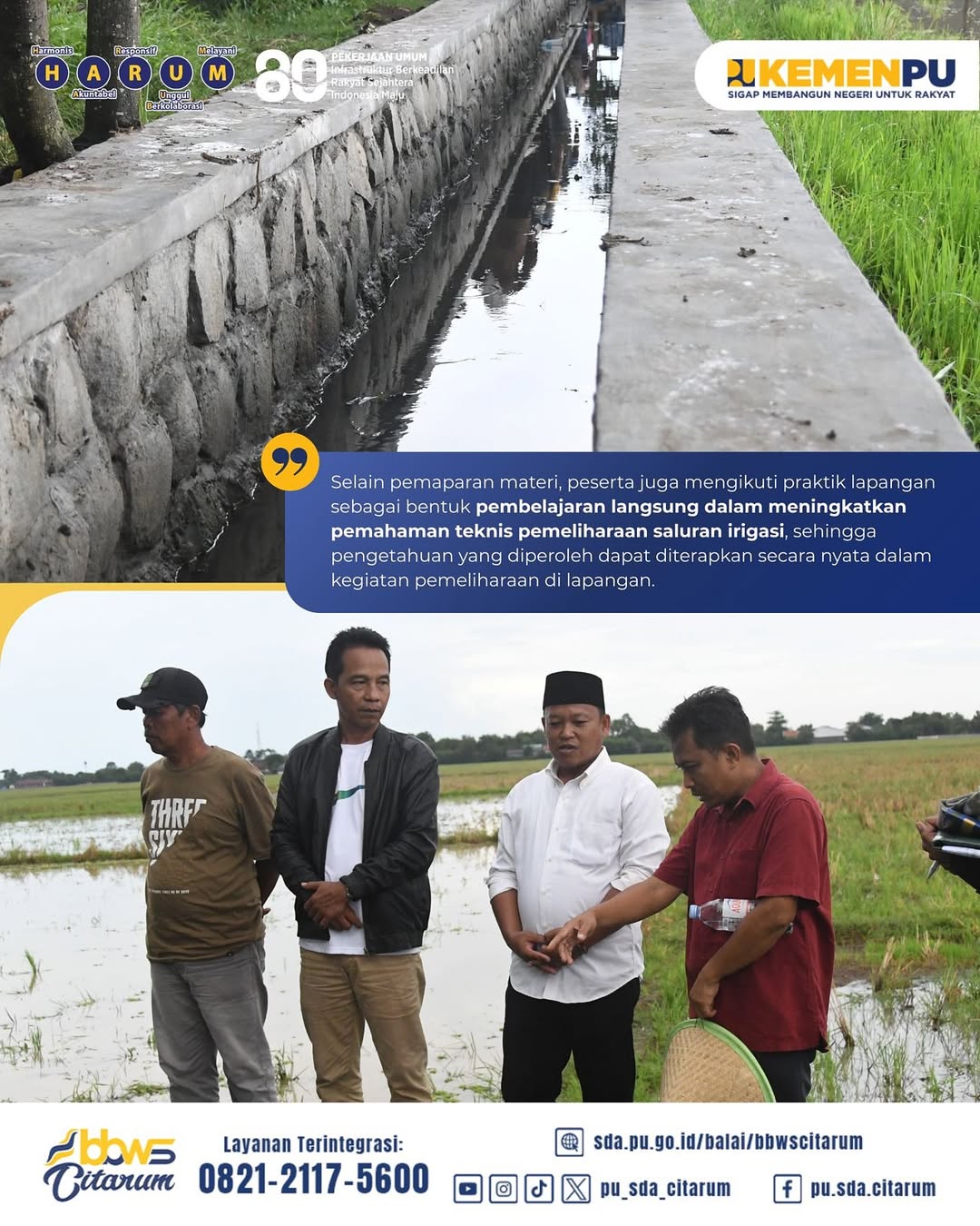 Bimbingan teknis dilaksanakan di dua lokasi, yaitu Kabupaten Cianjur dan Karawang Barat, dengan melibatkan P3A (Perkumpulan Petani Pemakai Air). Materi yang disampaikan meliputi pemeliharaan saluran irigasi serta penguatan peran kelembagaan P3A, GP3A, dan IP3A secara partisipatif dalam Program P3-TGAI, yang mencakup aspek edukasi, ekologi, dan ekonomi. Selain pemaparan materi, peserta juga mengikuti praktik lapangan sebagai bentuk pembelajaran langsung dalam meningkatkan pemahaman teknis pemeliharaan saluran irigasi.