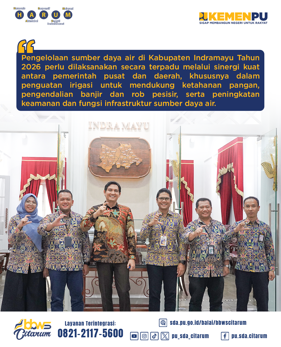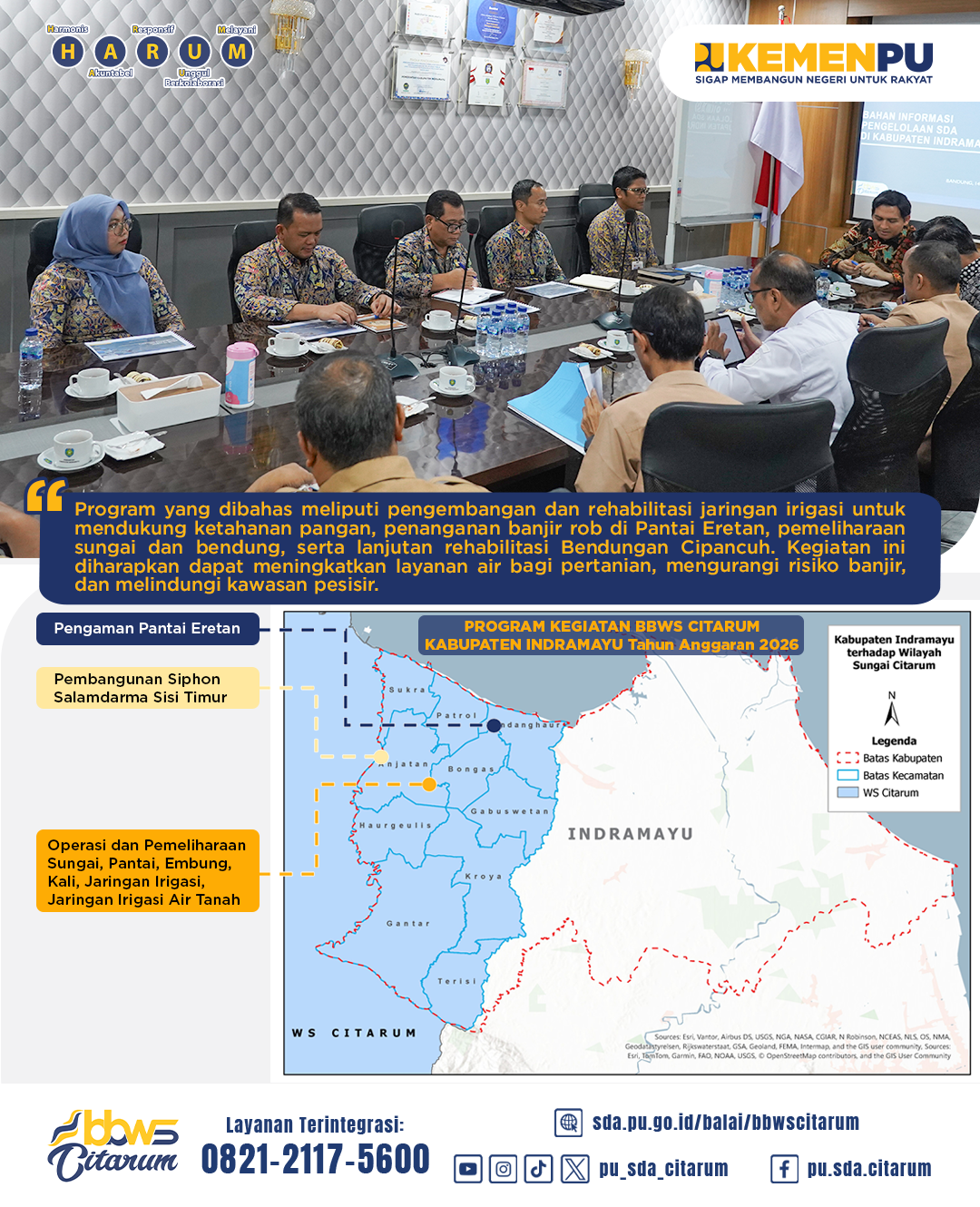 Rabu (14/01) BBWS Citarum bersama Bupati Indramayu beserta jajaran melaksanakan rapat koordinasi pengelolaan Sumber Daya Air Tahun Anggaran 2026 di Kabupaten Indramayu yang berada dalam Wilayah Sungai Citarum. Kabupaten Indramayu dilayani oleh Daerah Irigasi strategis kewenangan pusat, antara lain DI Jatiluhur–Saluran Tarum Timur seluas ±23.240 Ha dan DI Cipancuh seluas ±6.178 Ha, yang berperan penting dalam mendukung sektor pertanian dan ketahanan pangan nasional.