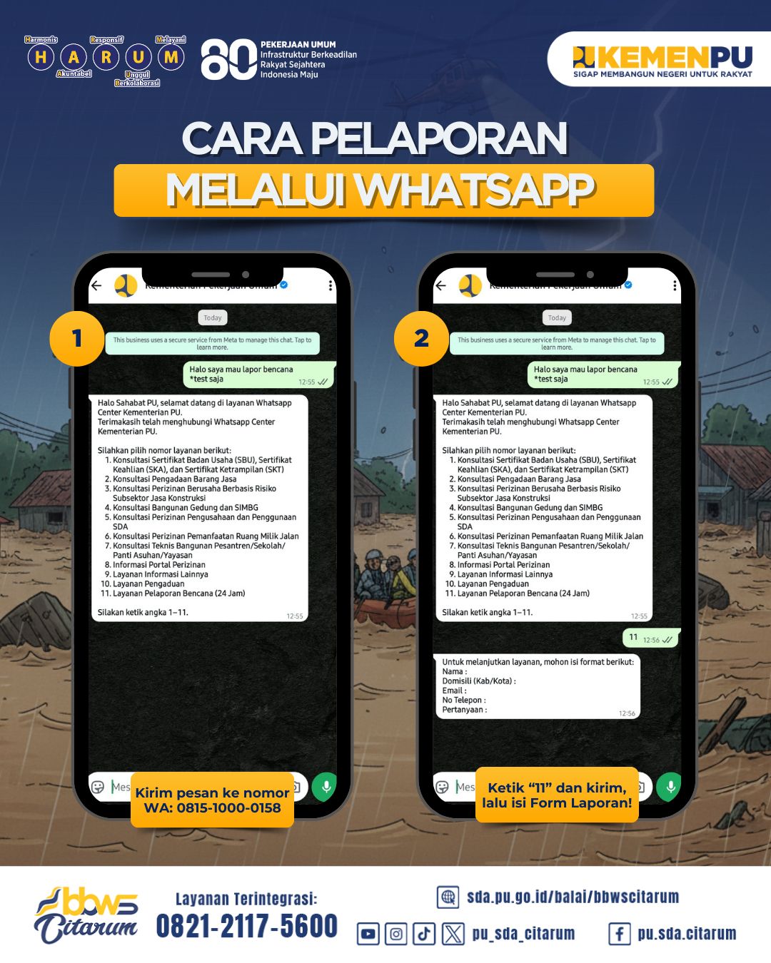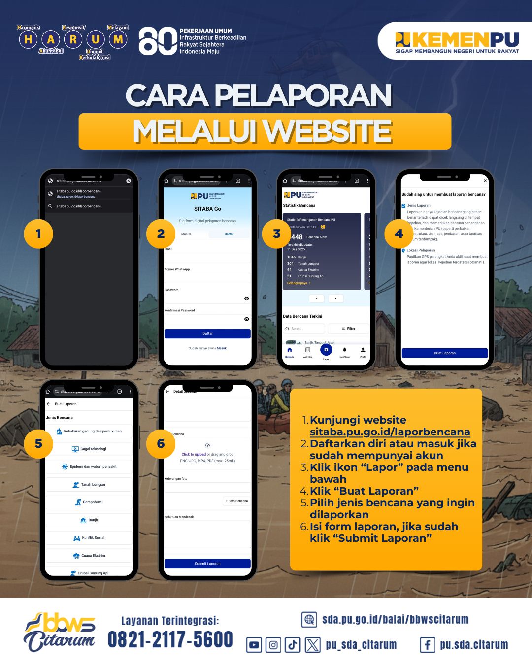 Kementerian Pekerjaan Umum menyediakan kanal pelaporan bencana yang bisa diakses masyarakat melalui: