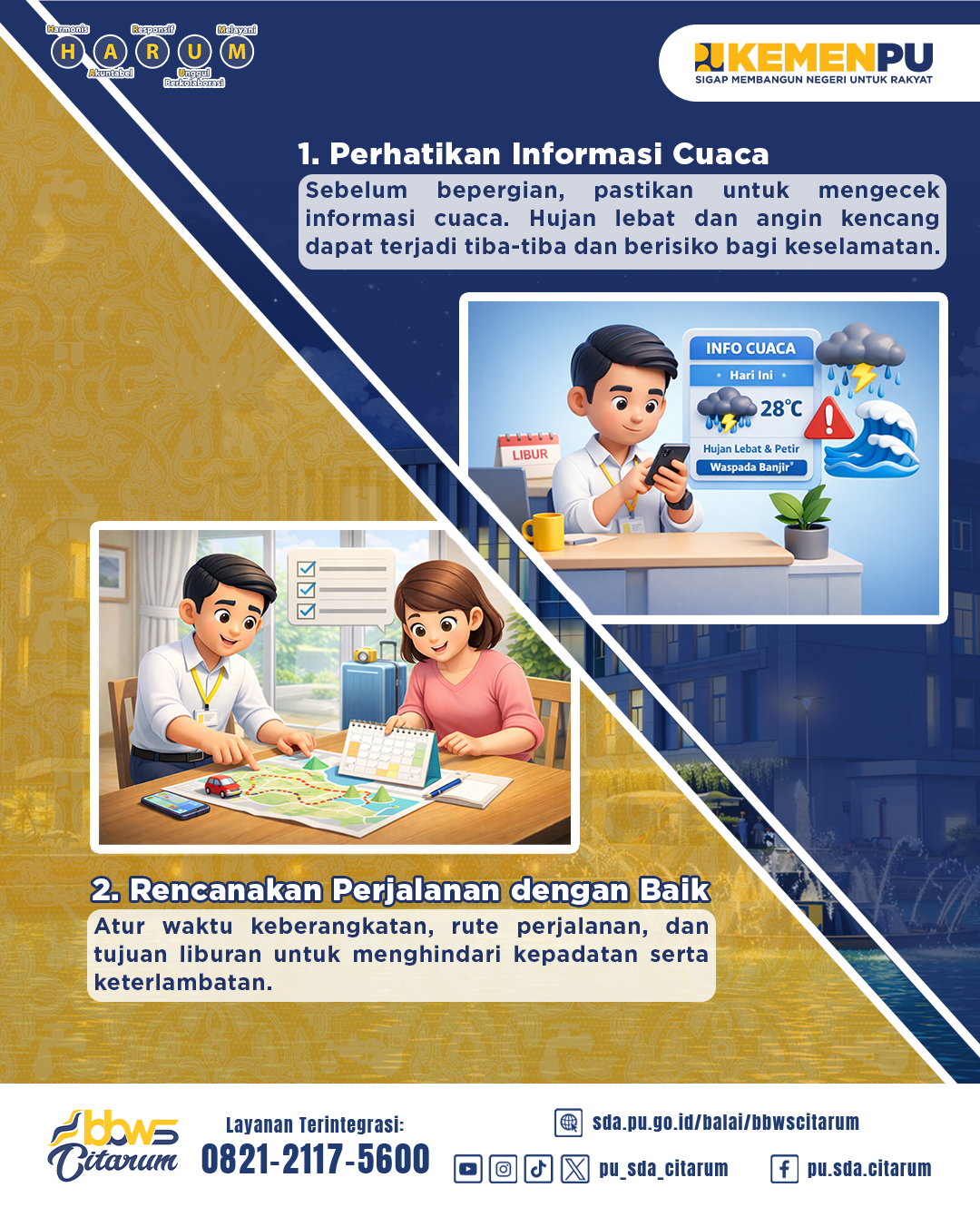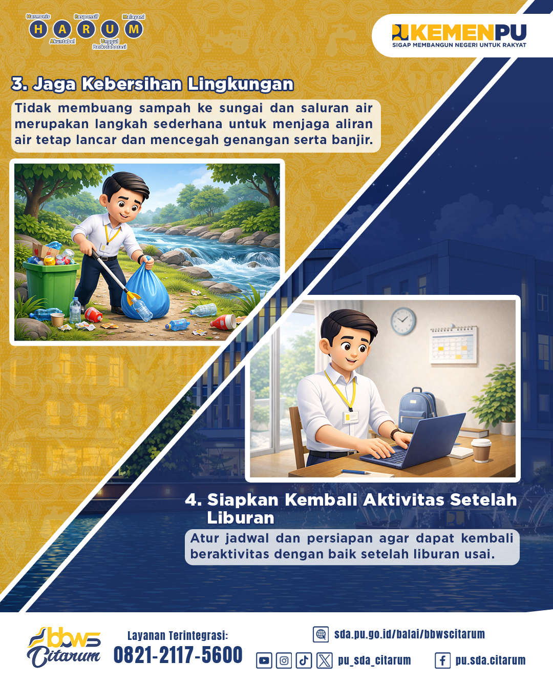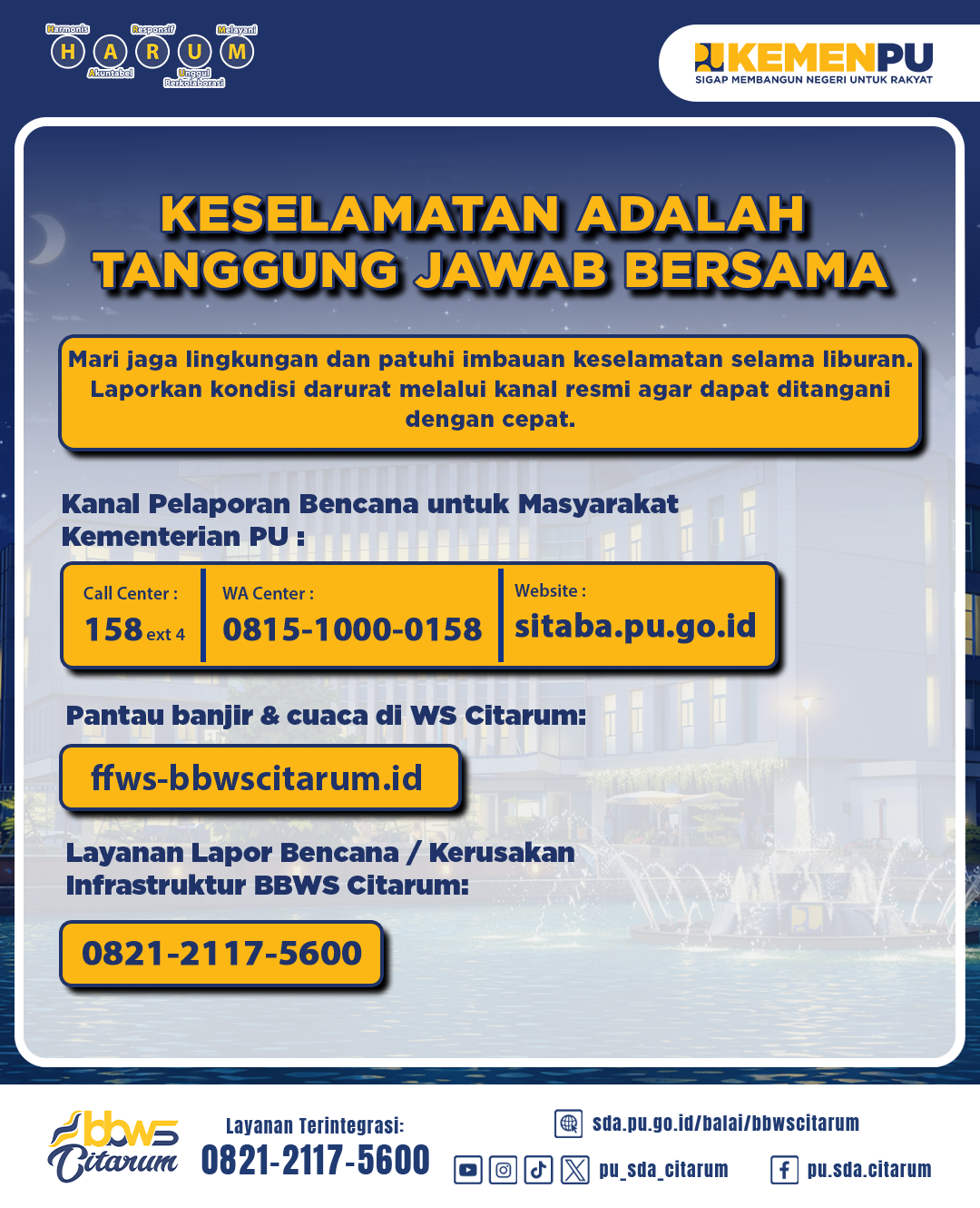 Keselamatan adalah tanggung jawab kita bersama. Jika kamu melihat kondisi darurat, potensi bencana, atau kerusakan sarana prasarana sumber daya air, jangan ragu untuk melaporkannya melalui kanal resmi pelayanan pengaduan Kementerian Pekerjaan Umum dan BBWS Citarum, agar bisa segera ditangani.