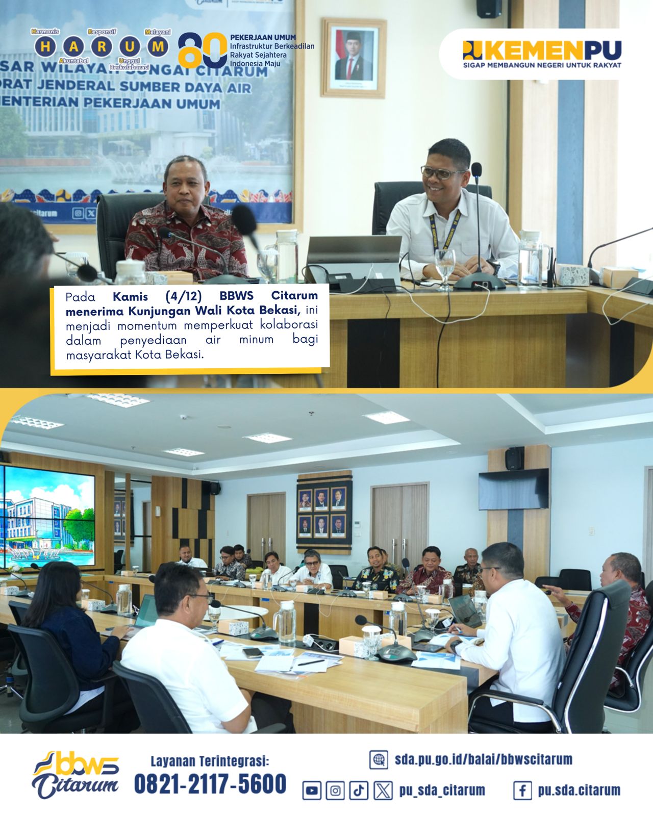 Kunjungan Wali Kota Bekasi ke BBWS Citarum menjadi ruang kolaborasi untuk memastikan pelayanan air minum yang aman, merata, dan berkelanjutan bagi masyarakat. Berbagai isu strategis disampaikan, mulai dari permohonan SIPSDA untuk sejumlah SPAM, evaluasi alih kelola aset pasca pemisahan Perumda Tirta Bhagasasi—Tirta Patriot, hingga tantangan kualitas dan kontinuitas air baku di Kali Bekasi.
