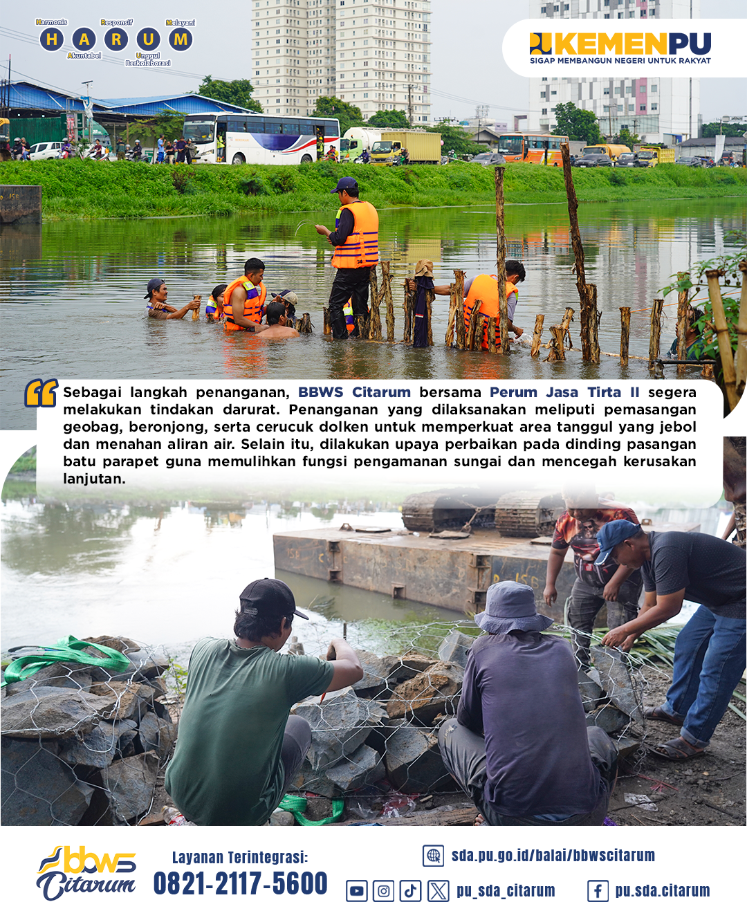 Karawang, 16 Januari 2026 Menindaklanjuti peningkatan debit air Sungai Kalimalang, BBWS Citarum bersama Perum Jasa Tirta II telah melaksanakan penanganan darurat di Kecamatan Telukjambe Barat, Kabupaten Karawang.