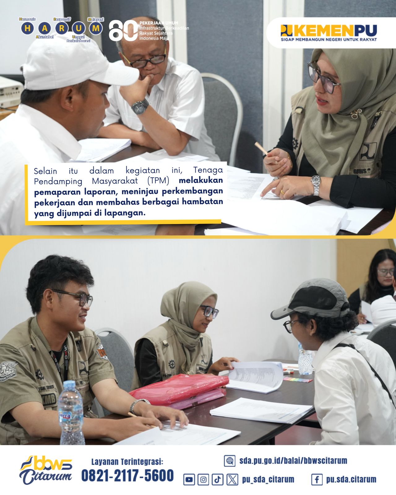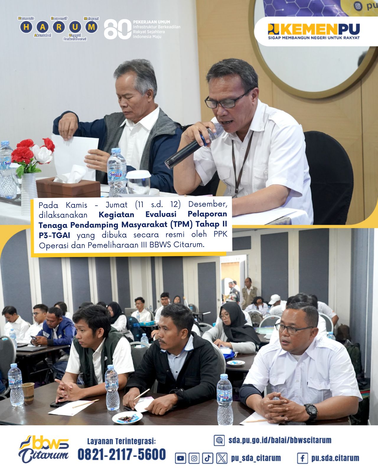 Pada Kamis - Jumat (11 s.d. 12) Desember, telah dilaksanakan Kegiatan Evaluasi Pelaporan Tenaga Pendamping Masyarakat (TPM) Tahap II P3-TGAI sebagai upaya meningkatkan akuntabilitas, khususnya dalam rangka pertanggungjawaban keuangan dan pencapaian output pekerjaan sesuai dengan ketentuan yang berlaku. Acara dibuka secara resmi oleh PPK Operasi dan Pemeliharaan III BBWS Citarum.