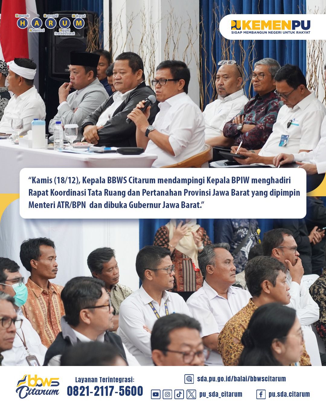 Kamis (18/12), Kepala Balai Besar Wilayah Sungai (BBWS) Citarum mendampingi Kepala Badan Pengembangan Infrastruktur Wilayah (BPIW) menghadiri Rapat Koordinasi Tata Ruang dan Pertanahan Provinsi Jawa Barat.