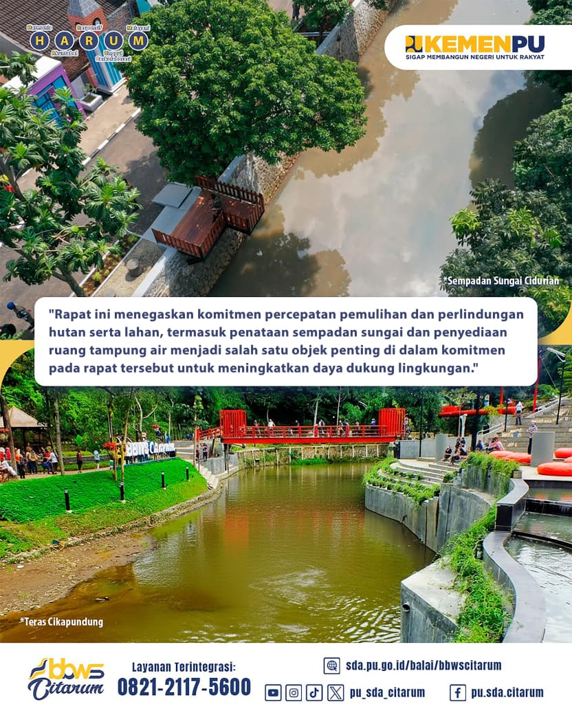 Dalam agenda tersebut, ditegaskan komitmen Kementerian Pekerjaan Umum (PU) dalam pembenahan tata ruang, khususnya pada sektor sumber daya air yang dilaksanakan melalui tiga tugas utama pengelolaan sumber daya air, yaitu melakukan konservasi sumber daya air, pengelolaan sumber daya air, serta pengendalian daya rusak air. Komitmen ini diwujudkan melalui penataan dan penertiban sempadan sungai serta penyediaan infrastruktur dan ruang-ruang tampungan air, sesuai dengan Peraturan Pemerintah (PP) Nomor 13 Tahun 2017 tentang Perubahan atas PP Nomor 26 Tahun 2008 mengenai Rencana Tata Ruang Wilayah Nasional.