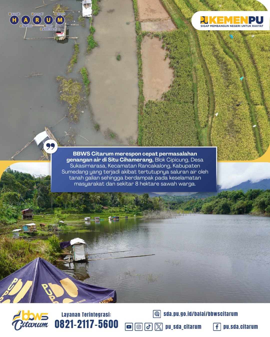 BBWS Citarum merespon cepat permasalahan genangan air di Situ Cihamerang, Blok Cipicung, Desa Sukasirnarasa, Kecamatan Rancakalong, Kabupaten Sumedang yang terjadi akibat tertutupnya saluran air oleh tanah galian sehingga berdampak pada keselamatan masyarakat dan sekitar 8 hektare sawah warga.