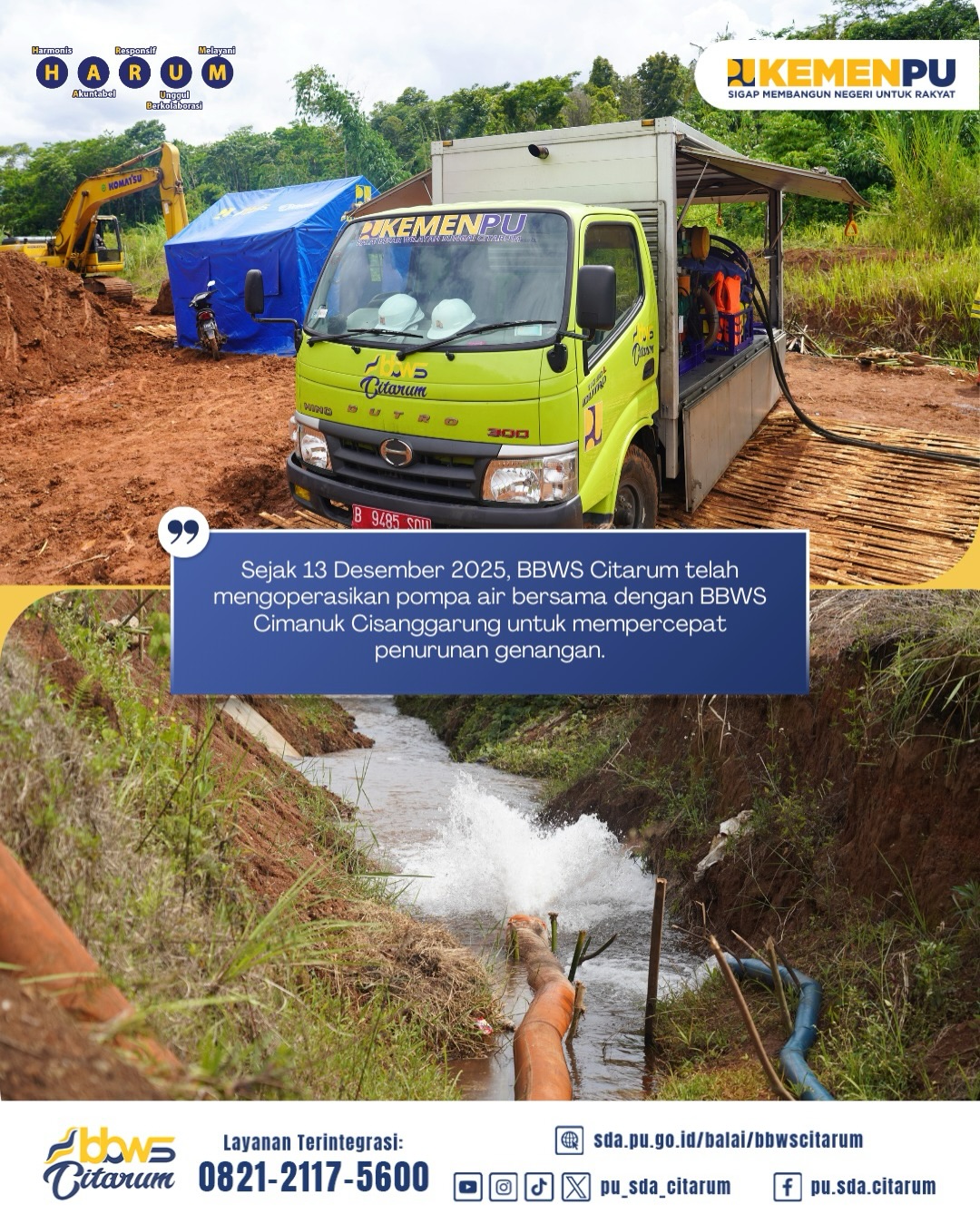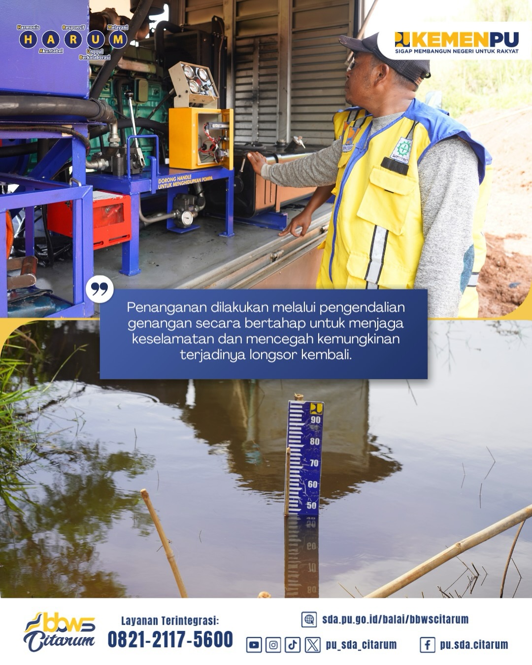 Penanganan dilakukan melalui pengendalian genangan secara bertahap untuk menjaga keselamatan dan mencegah kemungkinan terjadinya longsor kembali. Sejak 13 Desember 2025, BBWS Citarum telah mengoperasikan pompa air bersama dengan BBWS Cimanuk Cisanggarung @pu_sda_cimancis untuk mempercepat penurunan genangan.