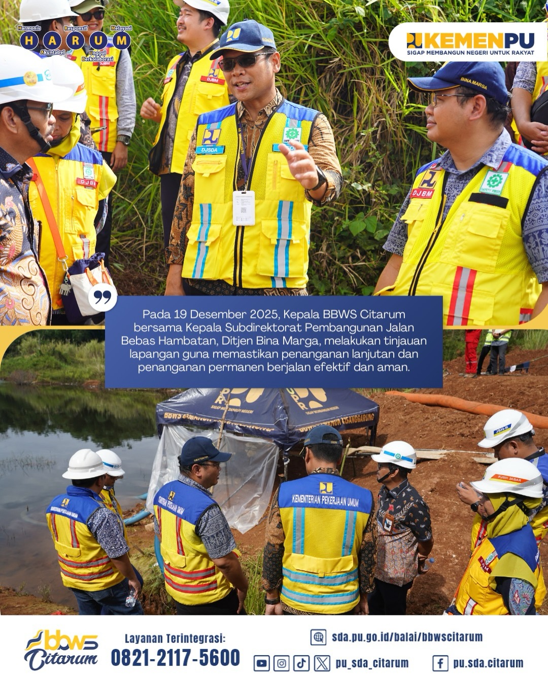 Pada 19 Desember 2025, Kepala BBWS Citarum bersama Kepala Subdirektorat Pembangunan Jalan Bebas Hambatan, Ditjen Bina Marga, melakukan tinjauan lapangan guna memastikan penanganan lanjutan dan penanganan permanen berjalan efektif dan aman.