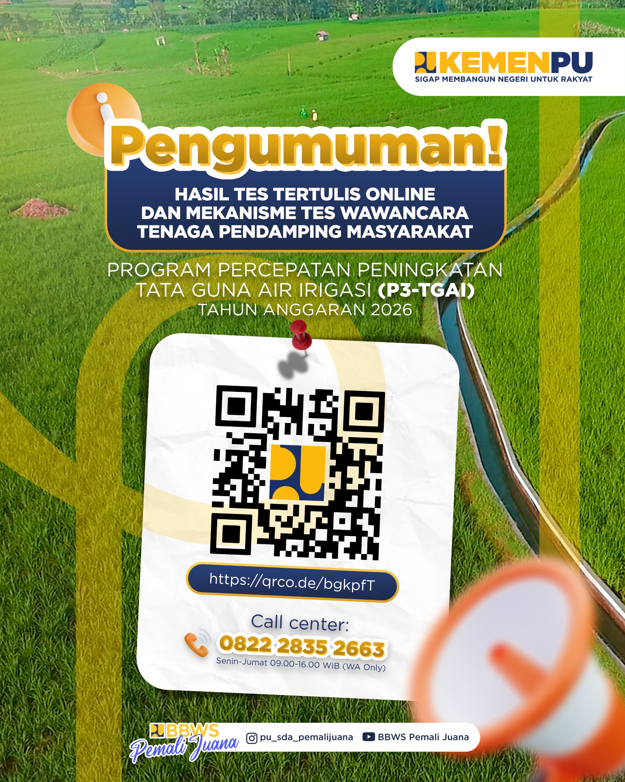 Selamat kepada para kandidat pelamar yang telah lolos seleksi tes tertulis Pengadaan Tenaga Pendamping Masyarakat (TPM) P3-TGAI BBWS Pemali Juana Tahun Anggaran 2026