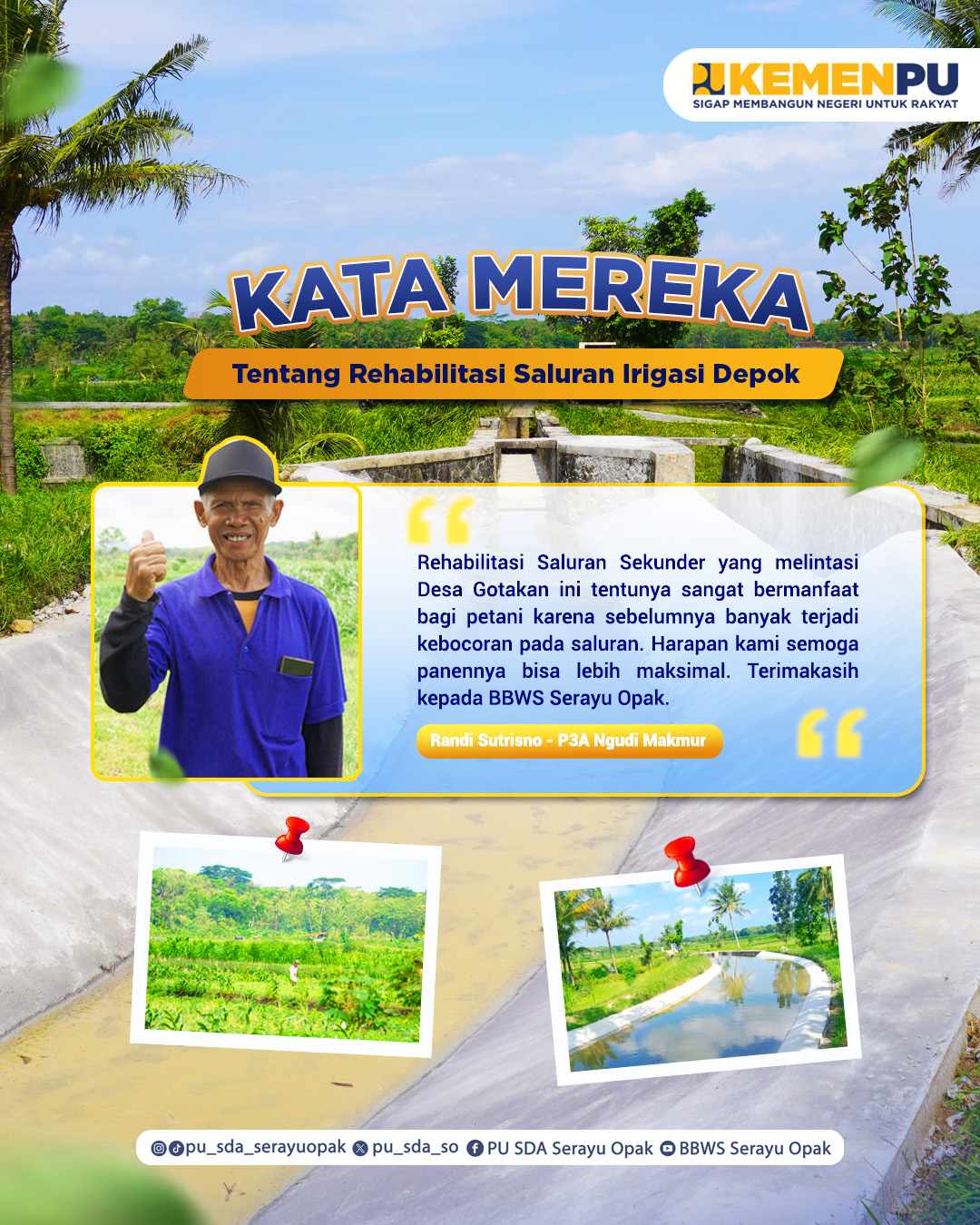 “kami sangat berterimakasih atas rehabilitasi yang dilakukan oleh BBWS Serayu Opak. rehabilitasi ini juga tidak mengganggu pola tanam kami yang saat ini sedang menanam palawija. semoga air bisa merata dan dapat meningkatkan hasil pertanian kami,” tuturnya.