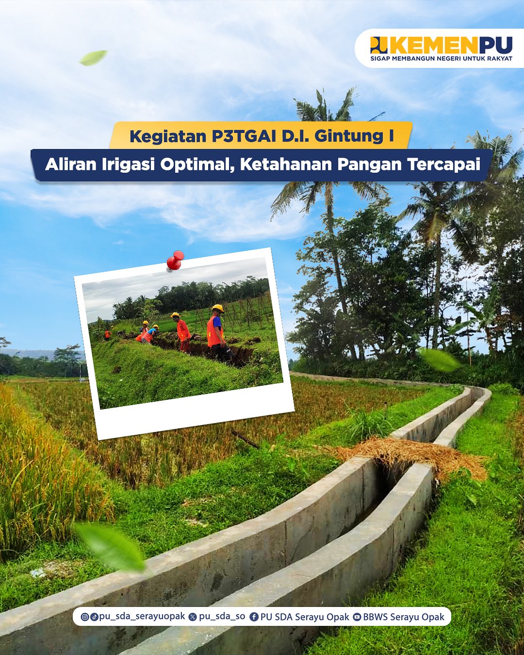 Sebagai bagian dari Program Percepatan Peningkatan Tata Guna Air Irigasi (P3TGAI), kegiatan peningkatan saluran tersier di Daerah Irigasi (DI) Gintung I sepanjang 436 meter ini dilaksanakan oleh Balai Besar Wilayah Sungai (BBWS) Serayu Opak. Kegiatan ini bertempat Desa Tumiyang, Kecamatan Pekuncen, Kabupaten Banyumas.