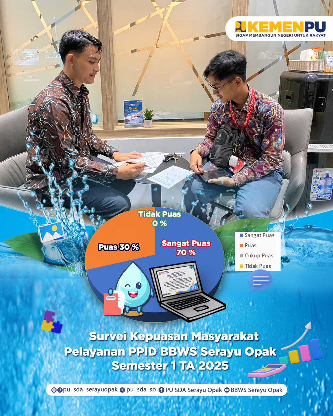 01 July 2025 Hasil Survei Kepuasan Masyarakat pada Pelayanan PPID BBWS Serayu Opak Semester 1 TA 2025 Hasil SKM Pelayanan Informasi Publik Semester I Tahun 2025 BBWS SOBerdasarkan Survei Kepuasan Masyarakat (SKM) yang dilaksankaan Tim Pelayanan Informasi Publik Balai Besar Wilayah Sungai Serayu Opak periode Semester I Tahun 2025, diperoleh hasil Indeks Kepuasan Masyarakat mencapai 91,12 atau nilai A...