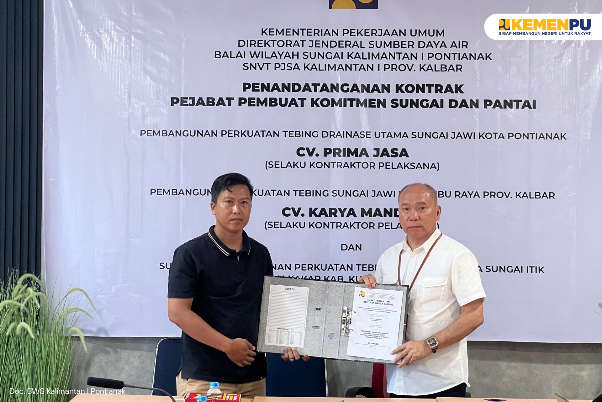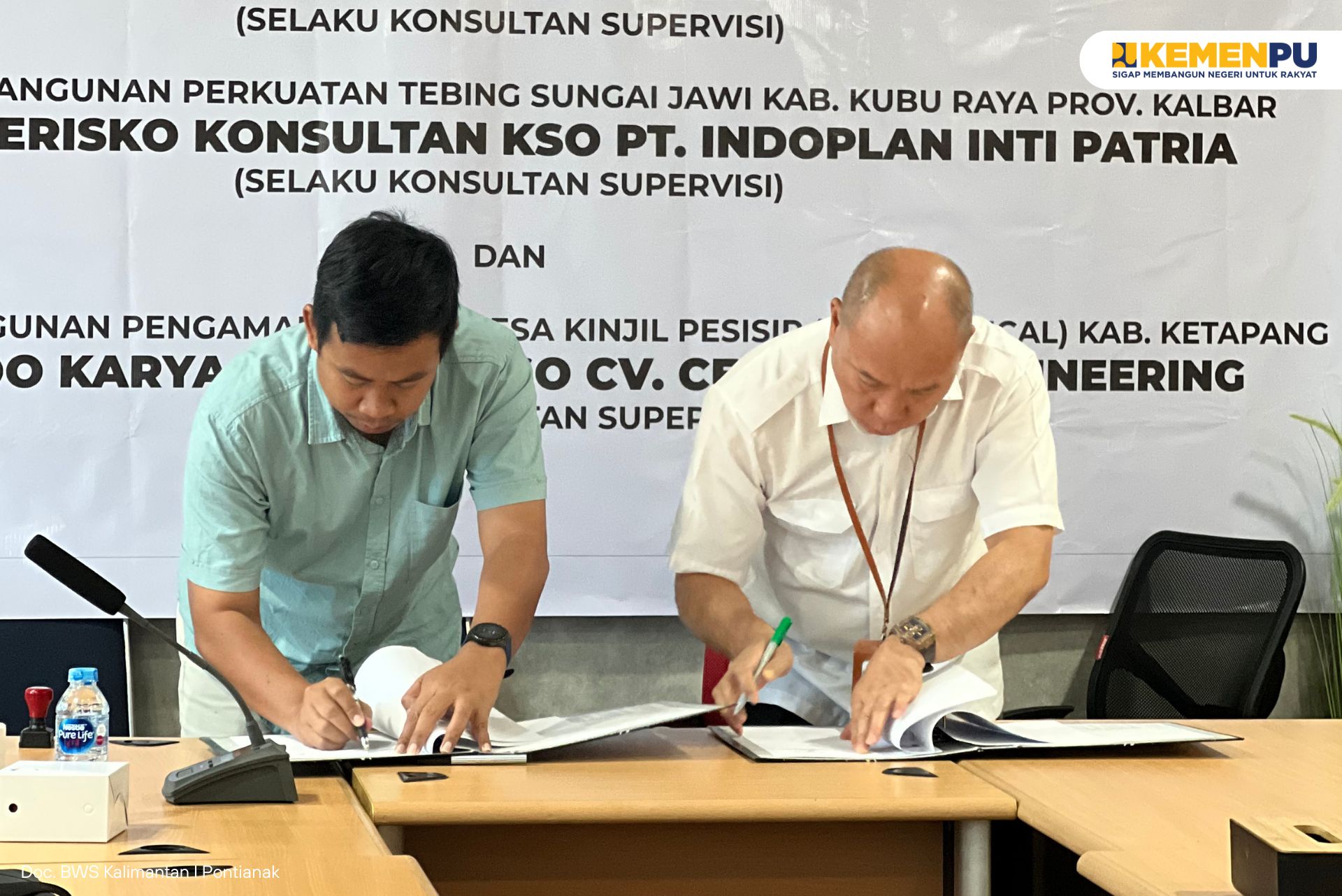 Balai Wilayah Sungai (BWS) Kalimantan I melalui SNVT Pelaksanaan Jaringan Sumber Air Provinsi Kalimantan Barat melaksanakan kegiatan Penandatanganan Kontrak untuk tiga pekerjaan infrastruktur strategis, yaitu Pembangunan Perkuatan Tebing Drainase Utama Sungai Jawi Kota Pontianak, Pembangunan Perkuatan Tebing Sungai Jawi Kabupaten Kubu Raya, serta Pembangunan Pengaman Pantai Desa Kinjil Pesisir (Pantai Pecal) Kabupaten Ketapang.