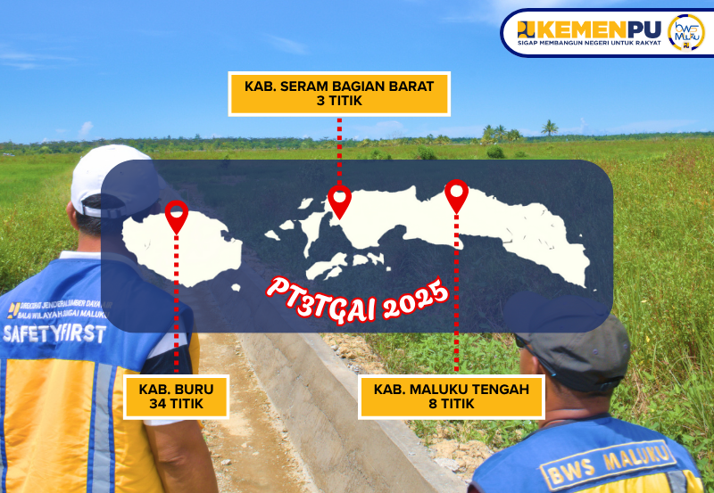 Kementerian Pekerjaan Umum melalui Balai Wilayah Sungai Maluku melaksanakan kegiatan P3TGAI di tahun 2025 secara serentak di 3 Kabupaten, 6 Kecamatan, 12 Desa dengan total 45 titik tersebar di Kabupaten Maluku Tengah sebanyak 8 titik, Kabupaten Seram Bagian Barat sebanyak 3 titik, dan Kabupaten Buru sebanyak 34 titik yang dilaksanakan oleh warga lokal sekitar titik.