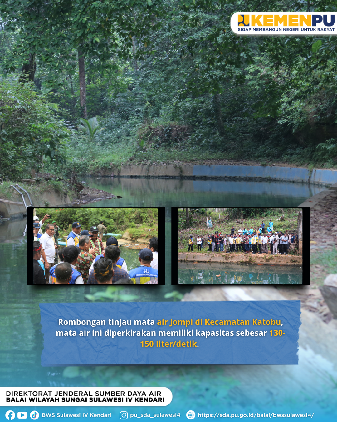 Rombongan kemudian tinjau mata air Jompi di Kecamatan Katobu, mata air ini diperkirakan memiliki kapasitas sebesar 130-150 Iiter/detik. “Melalui mata air ini akan dilakukan optimasi pemanfaatan dengan penambahan tampungan juga perbaikan pola operasi. Hal ini menjadi prioritas bersama, untuk memenuhi ketersediaan air bersih di Kabupaten Muna”. Ucap Kepala Balai