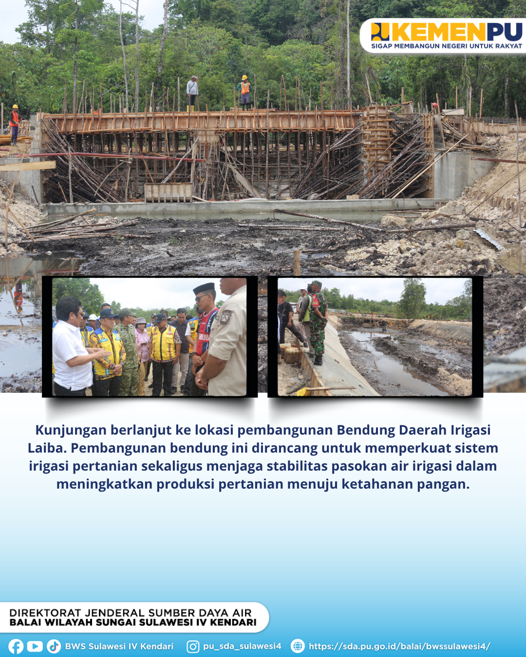 Kunjungan berlanjut ke lokasi pembangunan Bendung Daerah Irigasi Laiba. Pembangunan bendung ini dirancang untuk memperkuat sistem irigasi pertanian sekaligus menjaga stabilitas pasokan air irigasi dalam meningkatkan produksi pertanian menuju ketahanan pangan.