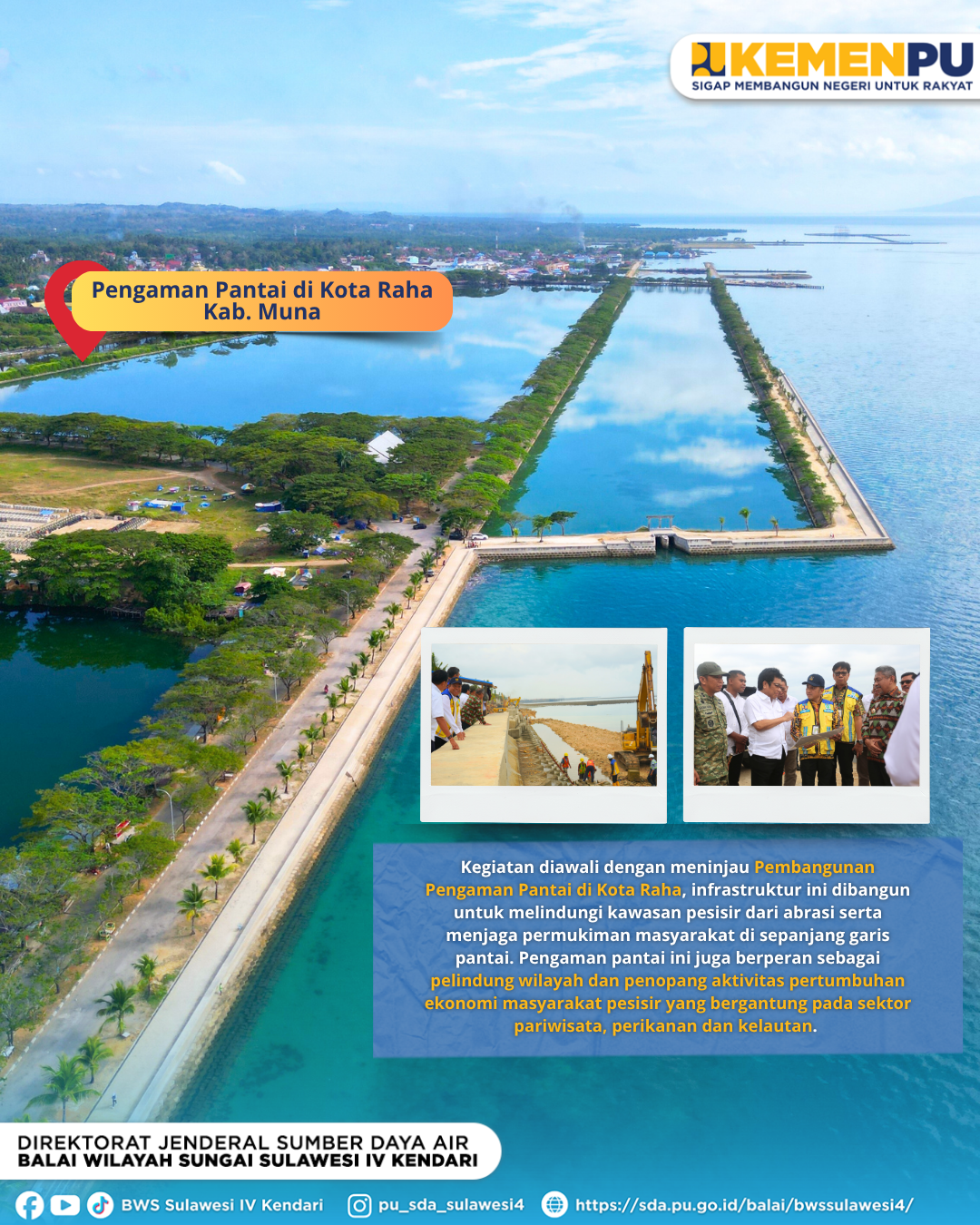 Kegiatan diawali dengan meninjau Pembangunan Pengaman Pantai di Kota Raha, infrastruktur ini dibangun untuk melindungi kawasan pesisir dari abrasi serta menjaga permukiman masyarakat di sepanjang garis pantai. Pengaman pantai ini juga berperan sebagai pelindung wilayah dan penopang aktivitas pertumbuhan ekonomi masyarakat pesisir yang bergantung pada sektor pariwisata, perikanan dan kelautan.