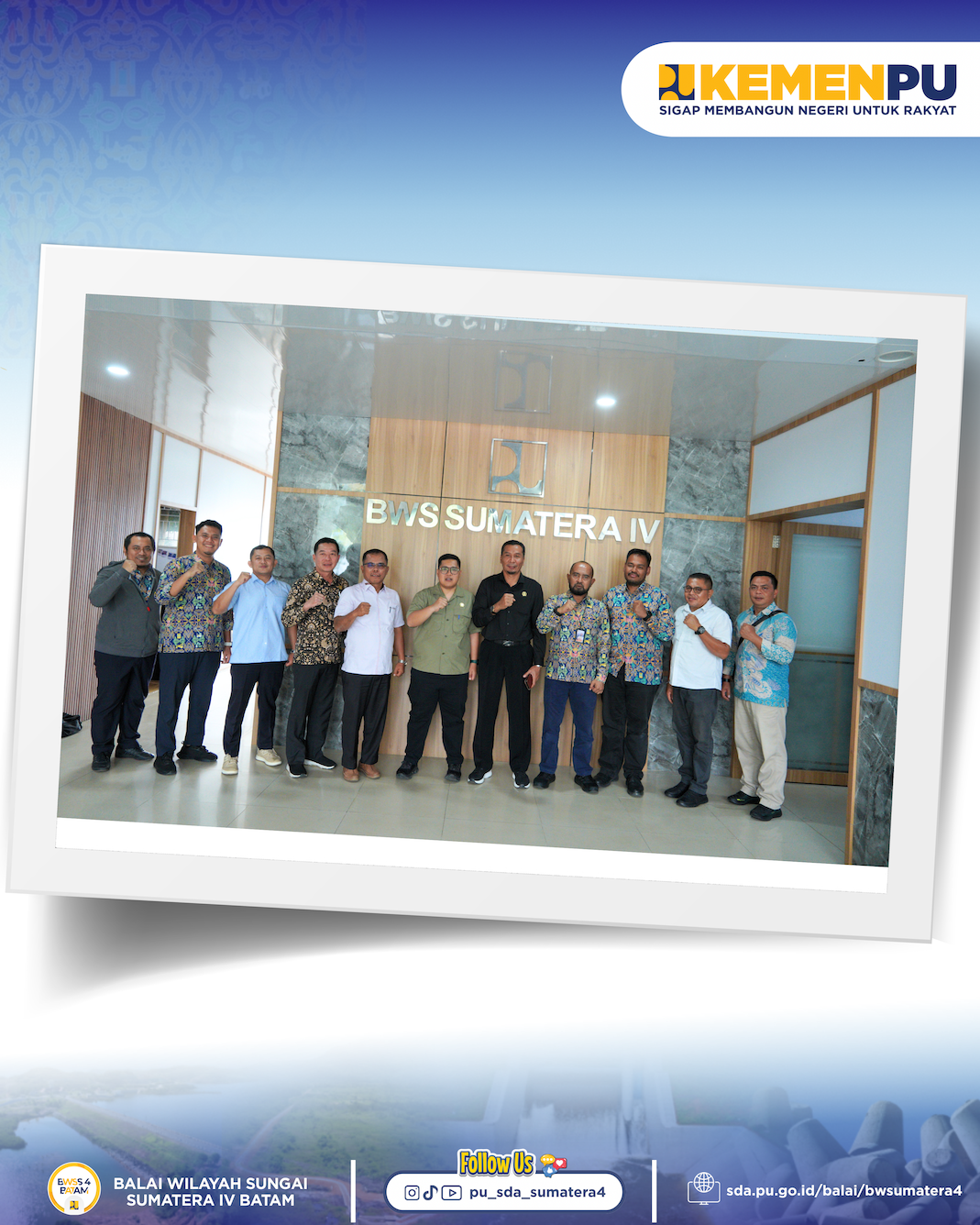 Kunjungan dan kegiatan koordinasi tersebut disambut oleh Kepala Seksi Keterpaduan Pembangunan Infrastruktur SDA, Kepala SNVT PJPA, bersama pejabat teknis terkait di lingkungan BWS Sumatera IV Batam.