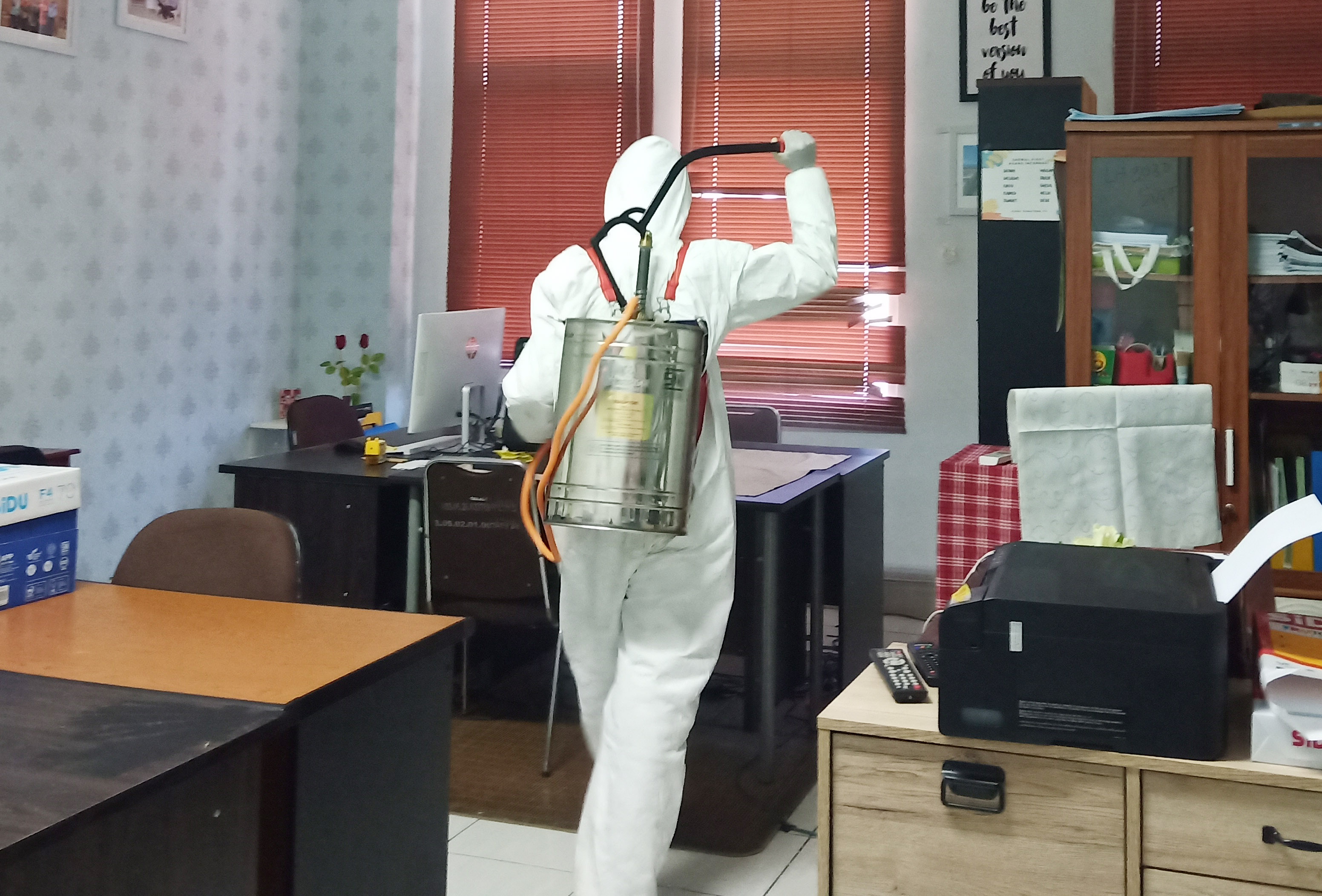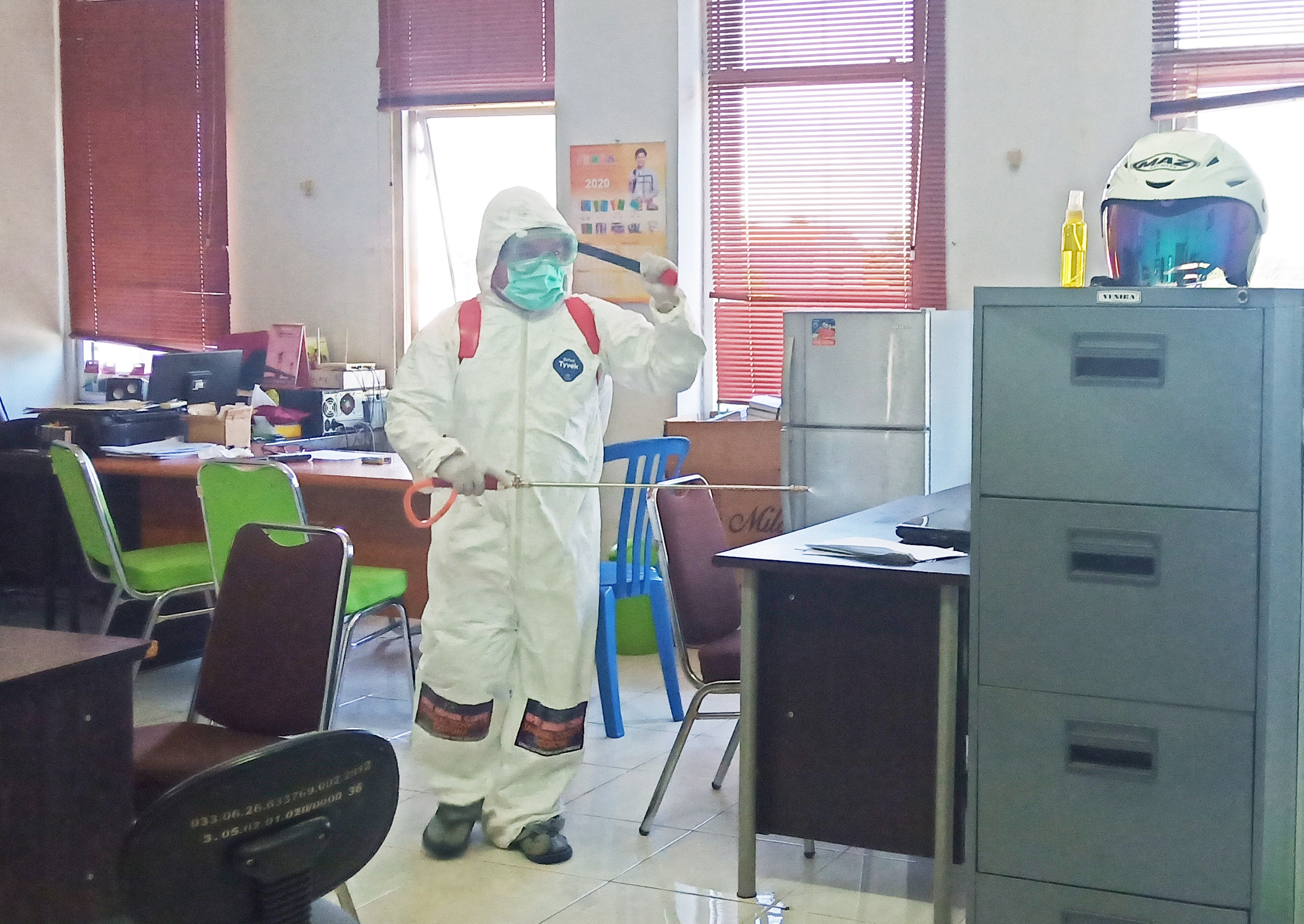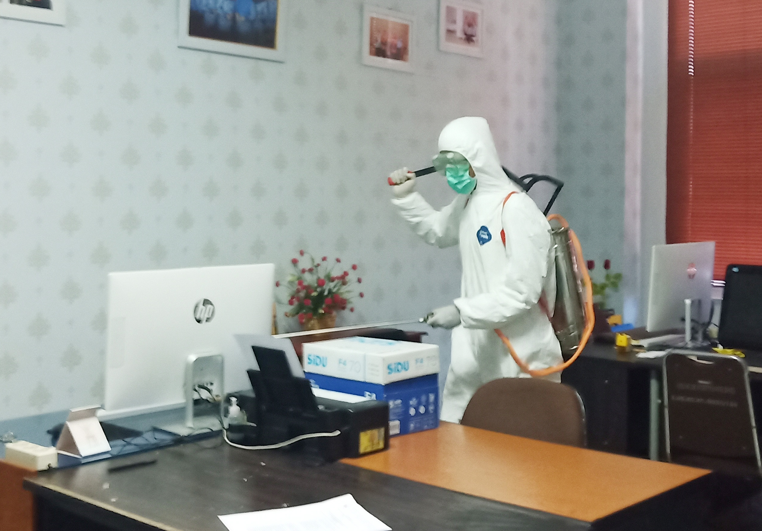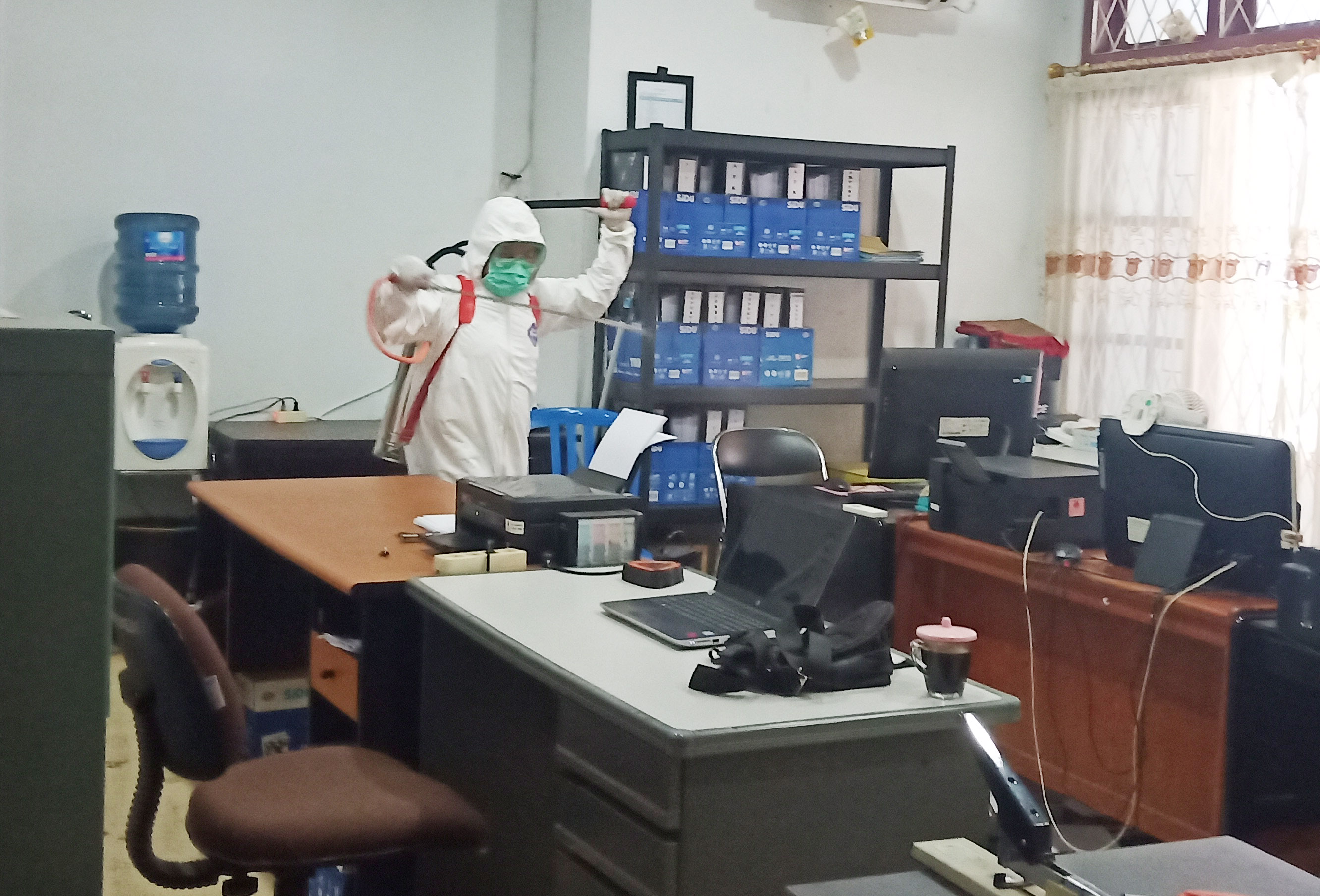 Penyemprotan cairan disinfektan ke seluruh ruangan kantor BWS Sumatera VII sebagai langkah pencegahan penyebaran virus corona (COVID-19) oleh Dinas Kesehatan Provinsi Bengkulu, Senin (30/3).