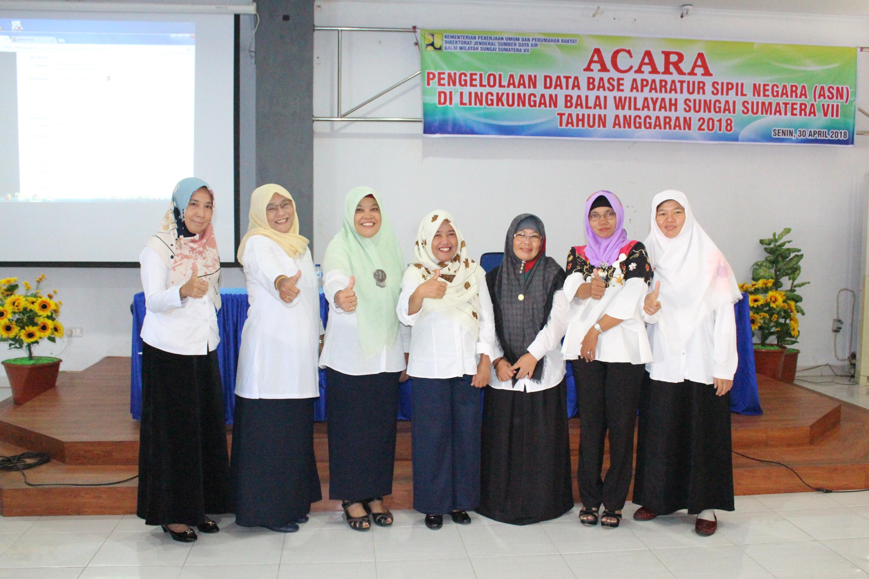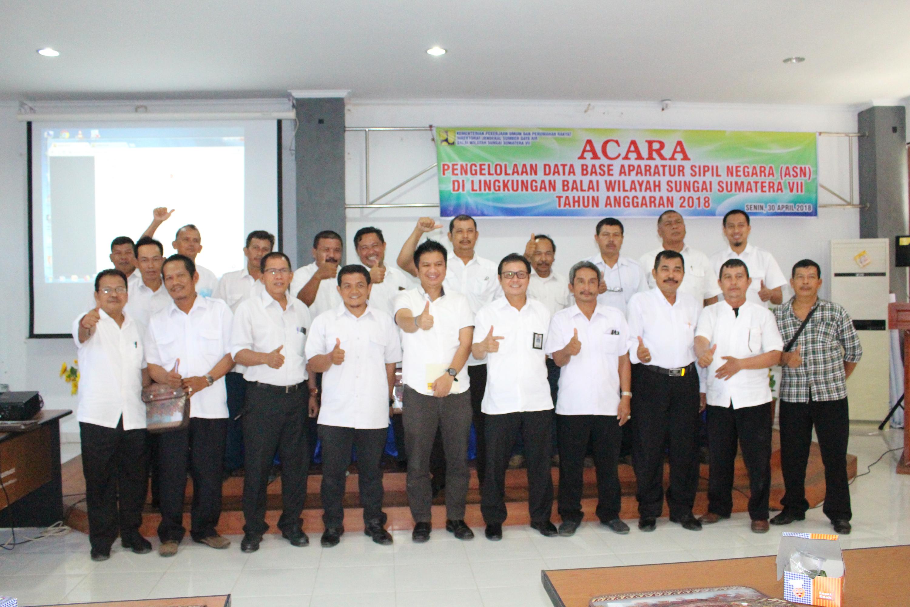 Senin 30 April 2018 telah diselenggarakan acara pengelolaan database Aparatur Sipil Negara (ASN) di lingkungan BWS Sumatera VII bertempat di Aula Teramang Muar-Nasal Padang Guci Kantor Balai Wilayah Sungai Sumatera VII dan dihadiri oleh 108 orang pegawai.